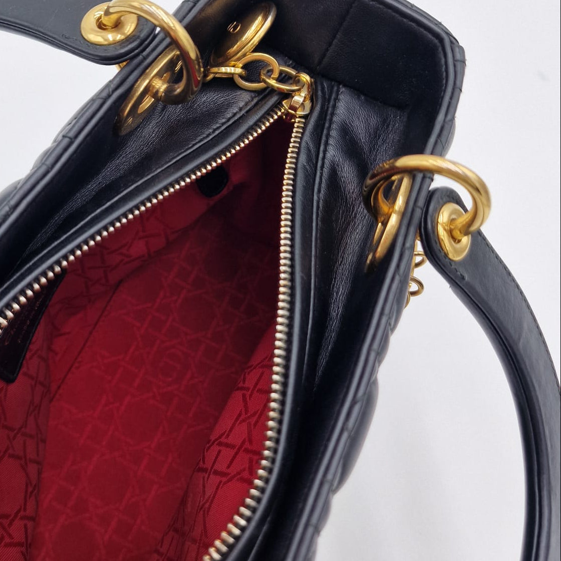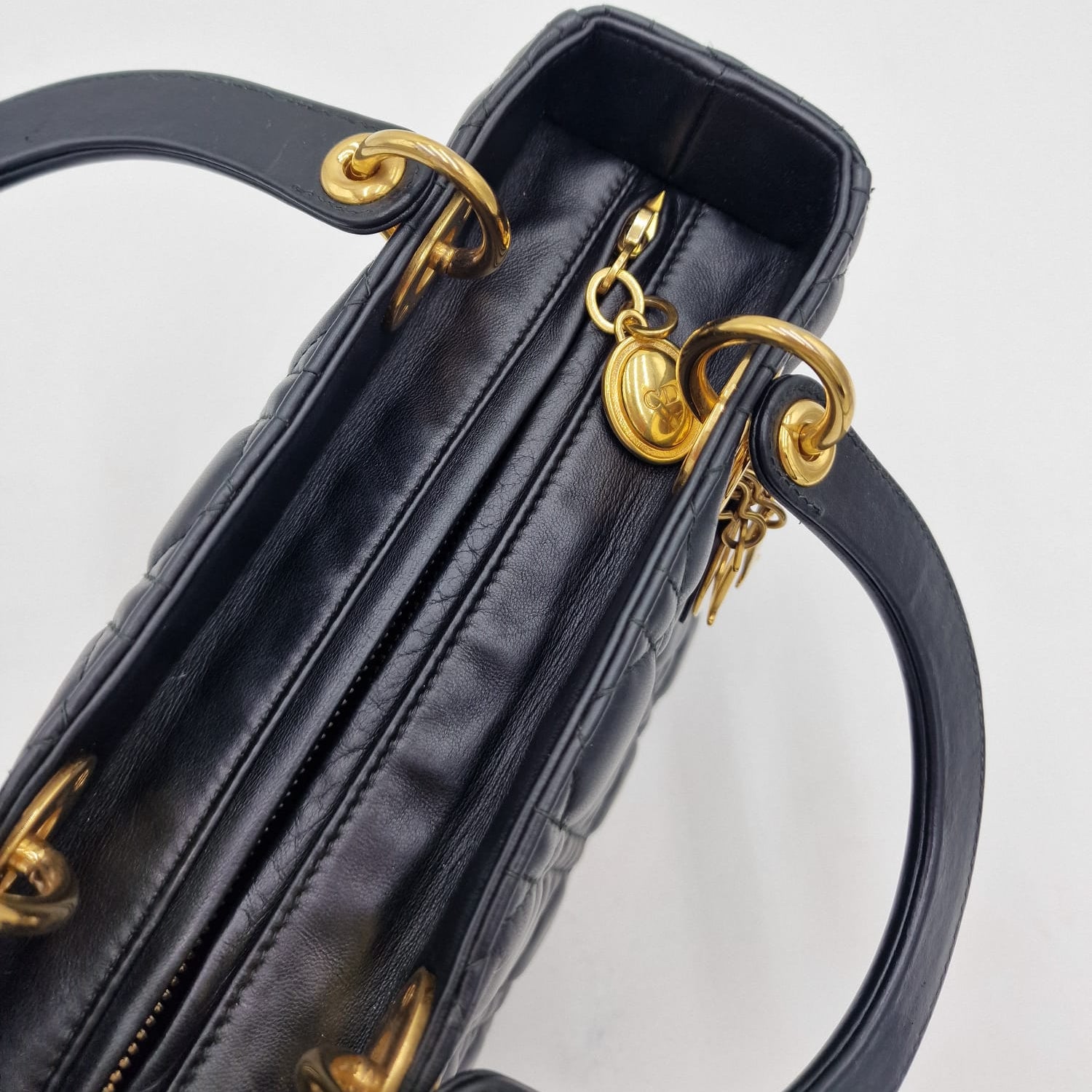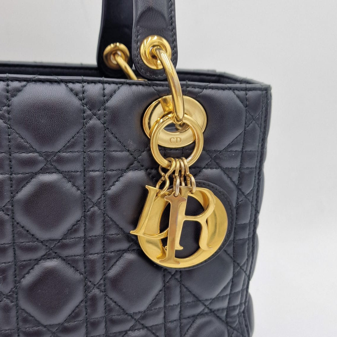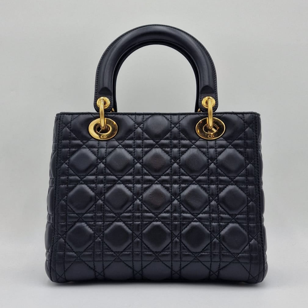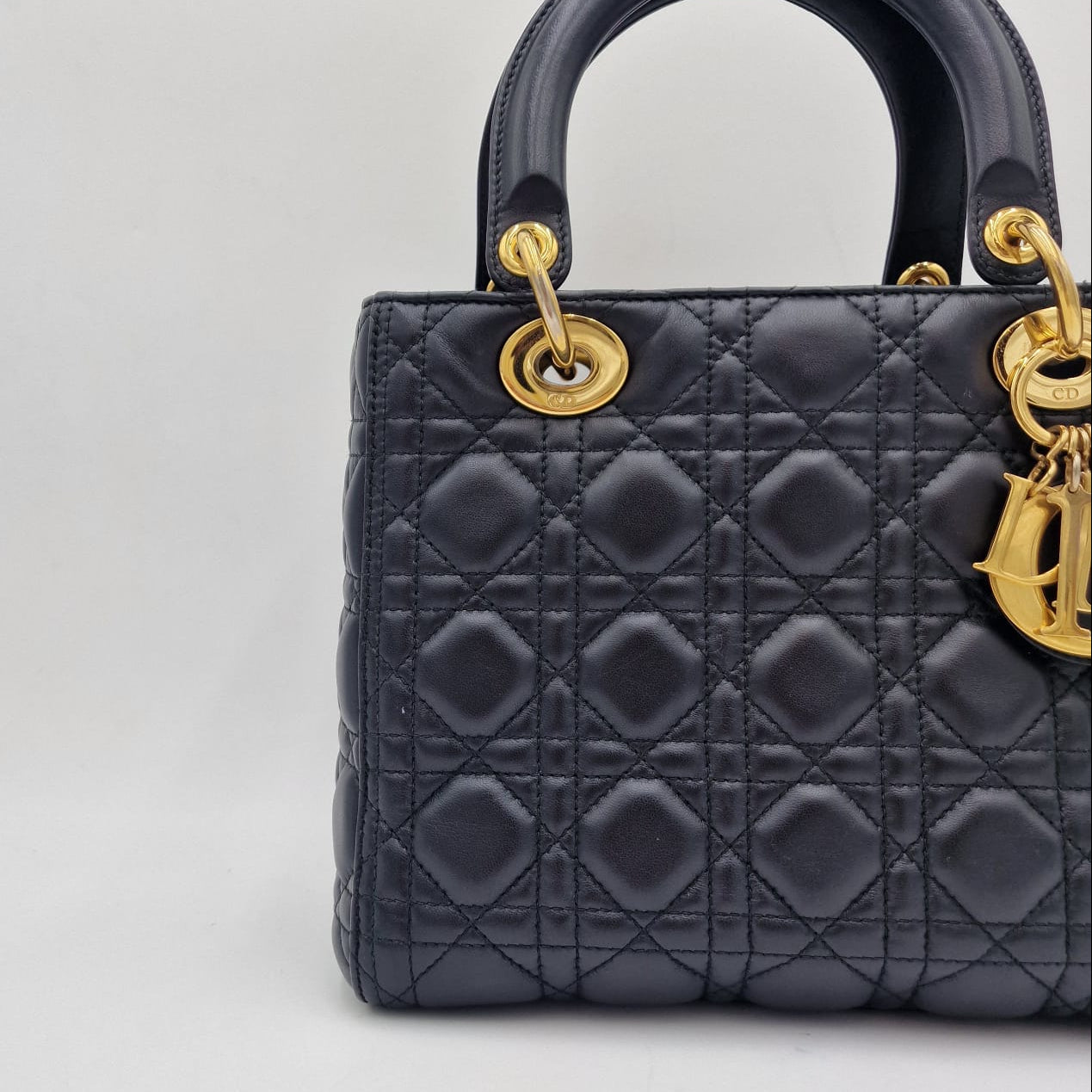 Lady Dior Medium confeccionada em pele de cordeiro preta com costura Cannage, criando uma textura acolchoada instantaneamente reconhecível. O metal com acabamento dourado D.I.O.R. encantos oferecem um fascínio elegante. Com alça de ombro fina e removível de couro, a bolsa Lady Dior média pode ser carregada na mão, no ombro ou na transversal.