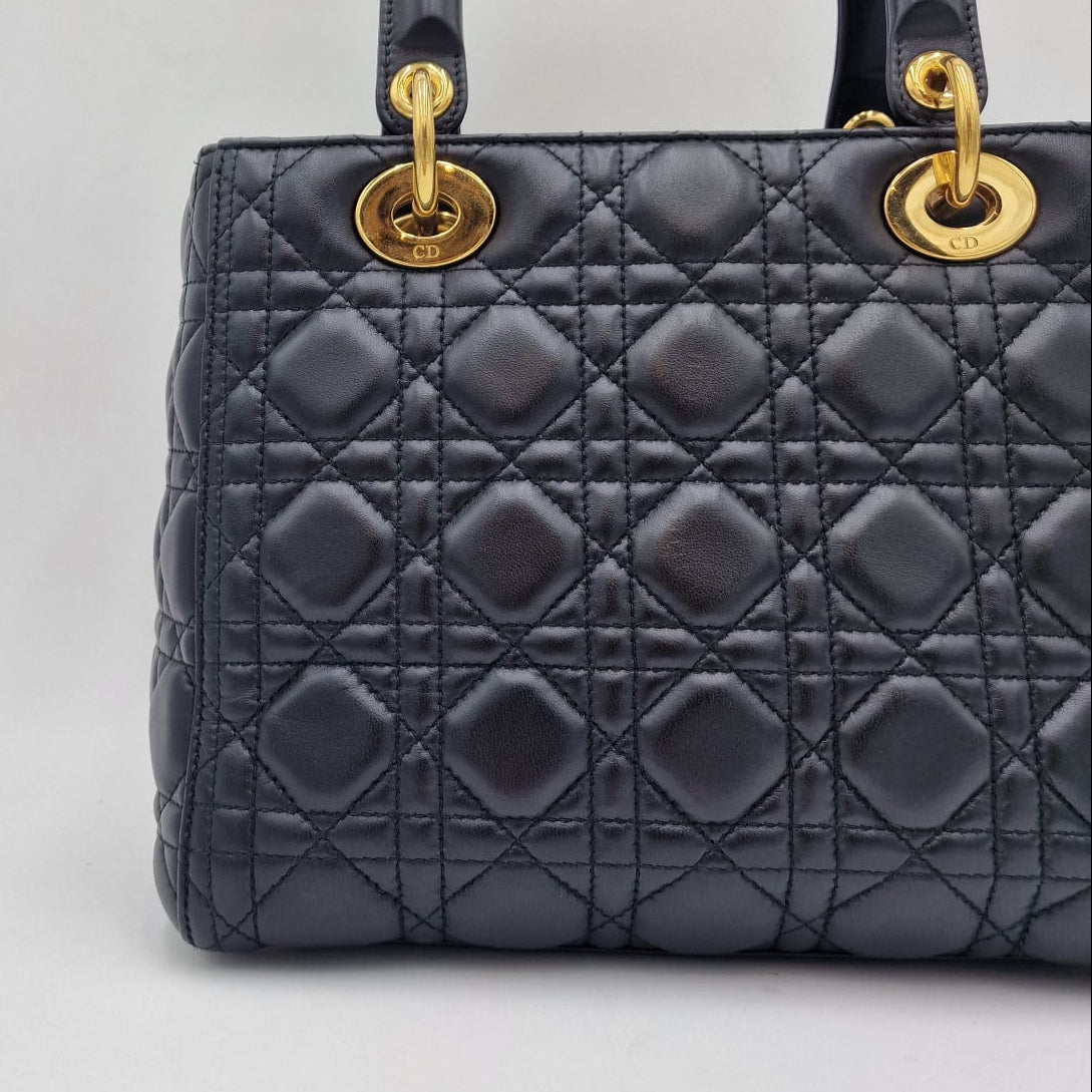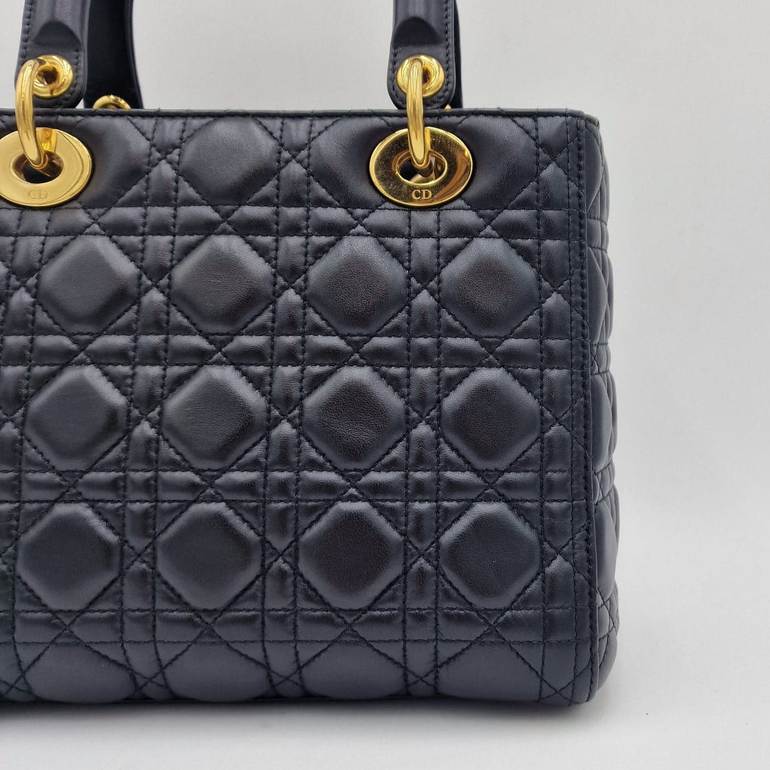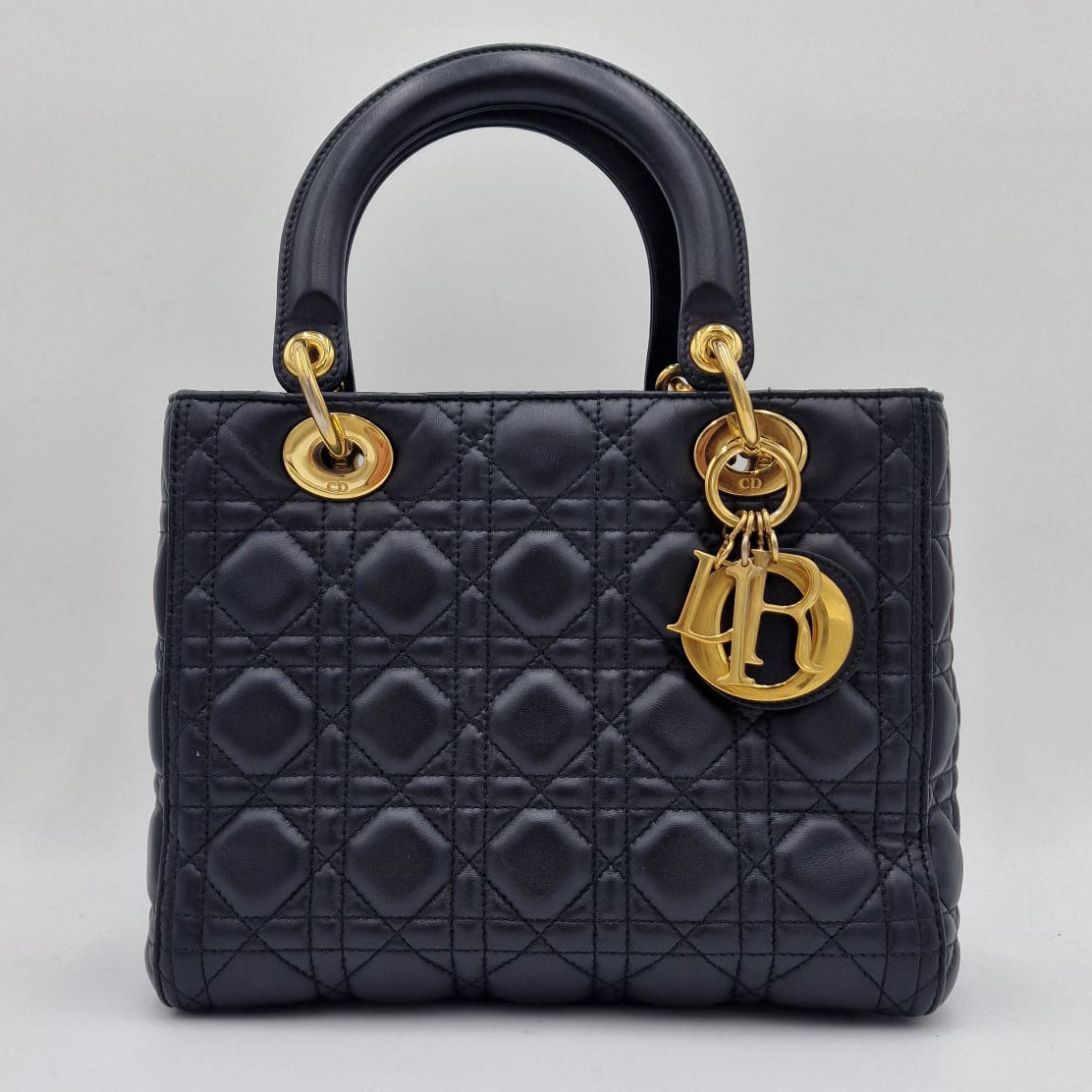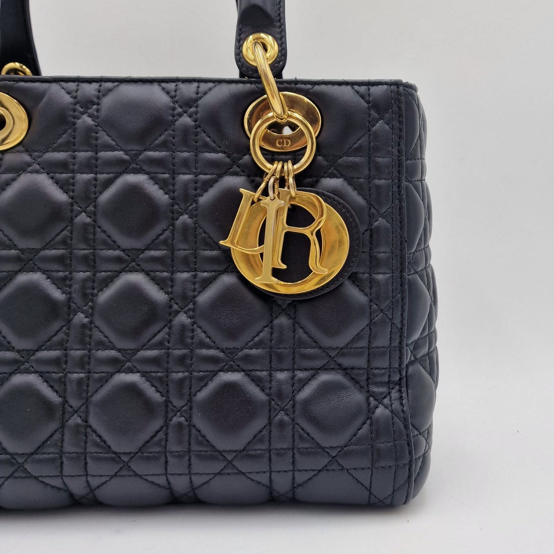 Lady Dior Medium confeccionada em pele de cordeiro preta com costura Cannage, criando uma textura acolchoada instantaneamente reconhecível. O metal com acabamento dourado D.I.O.R. encantos oferecem um fascínio elegante. Com alça de ombro fina e removível de couro, a bolsa Lady Dior média pode ser carregada na mão, no ombro ou na transversal.