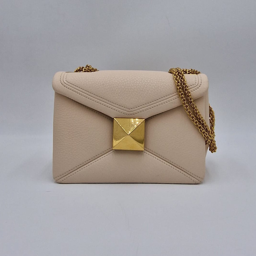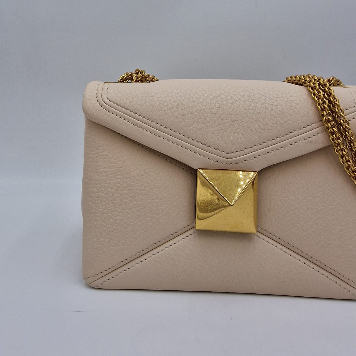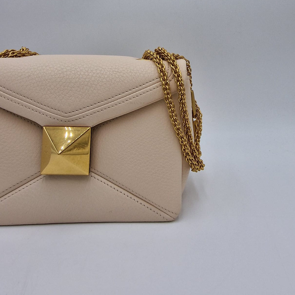 A Valentino Garavani One Stud é definida pela sua silhueta envelope e pelo Rockstud na frente, um elemento icónico da casa. Confeccionada em couro macio em Itália, esta mala pode ser usada no corpo ou no ombro graças à sua alça ajustável.