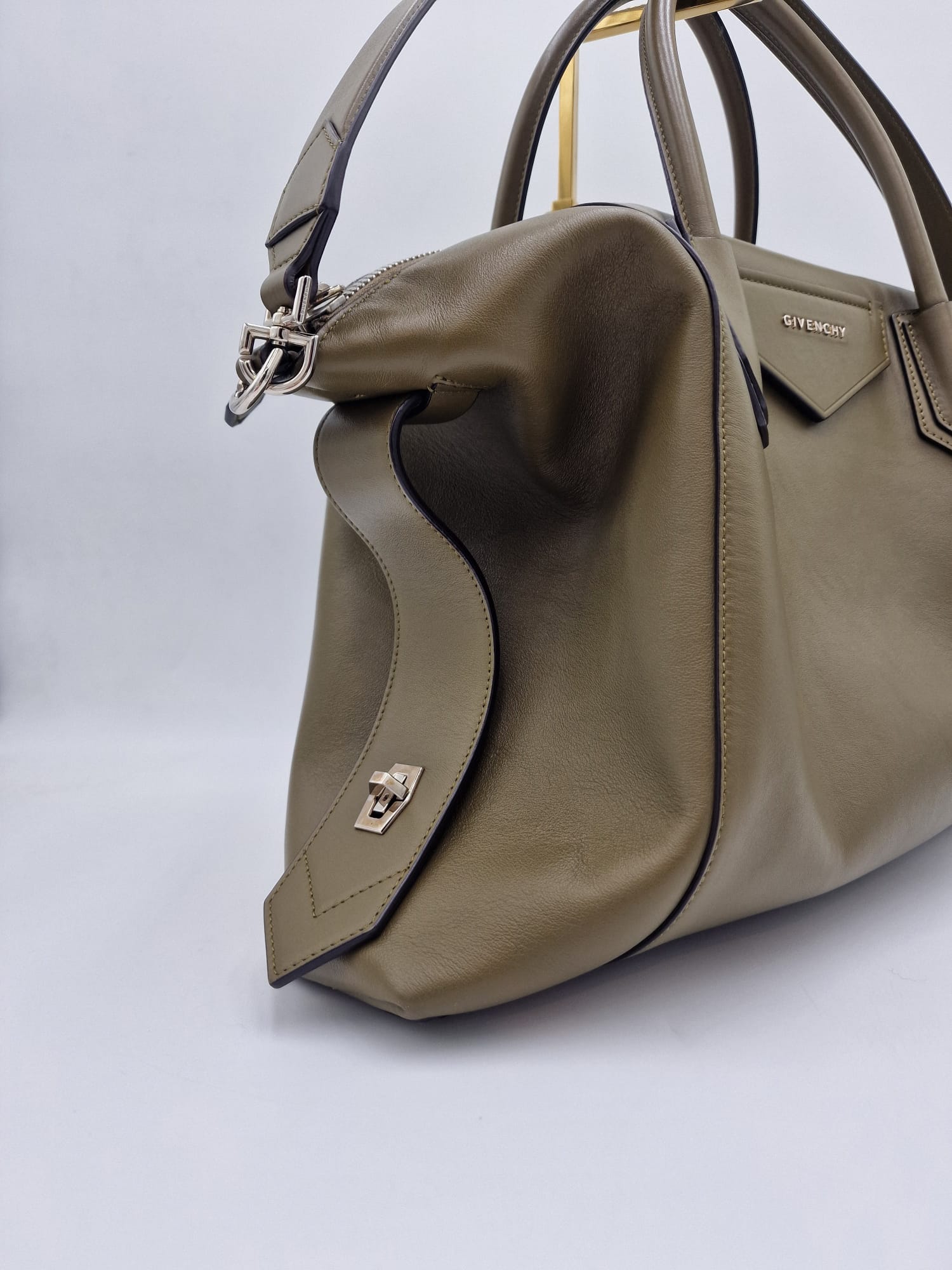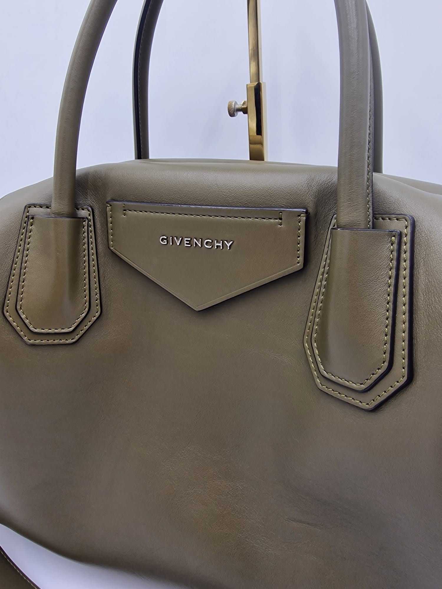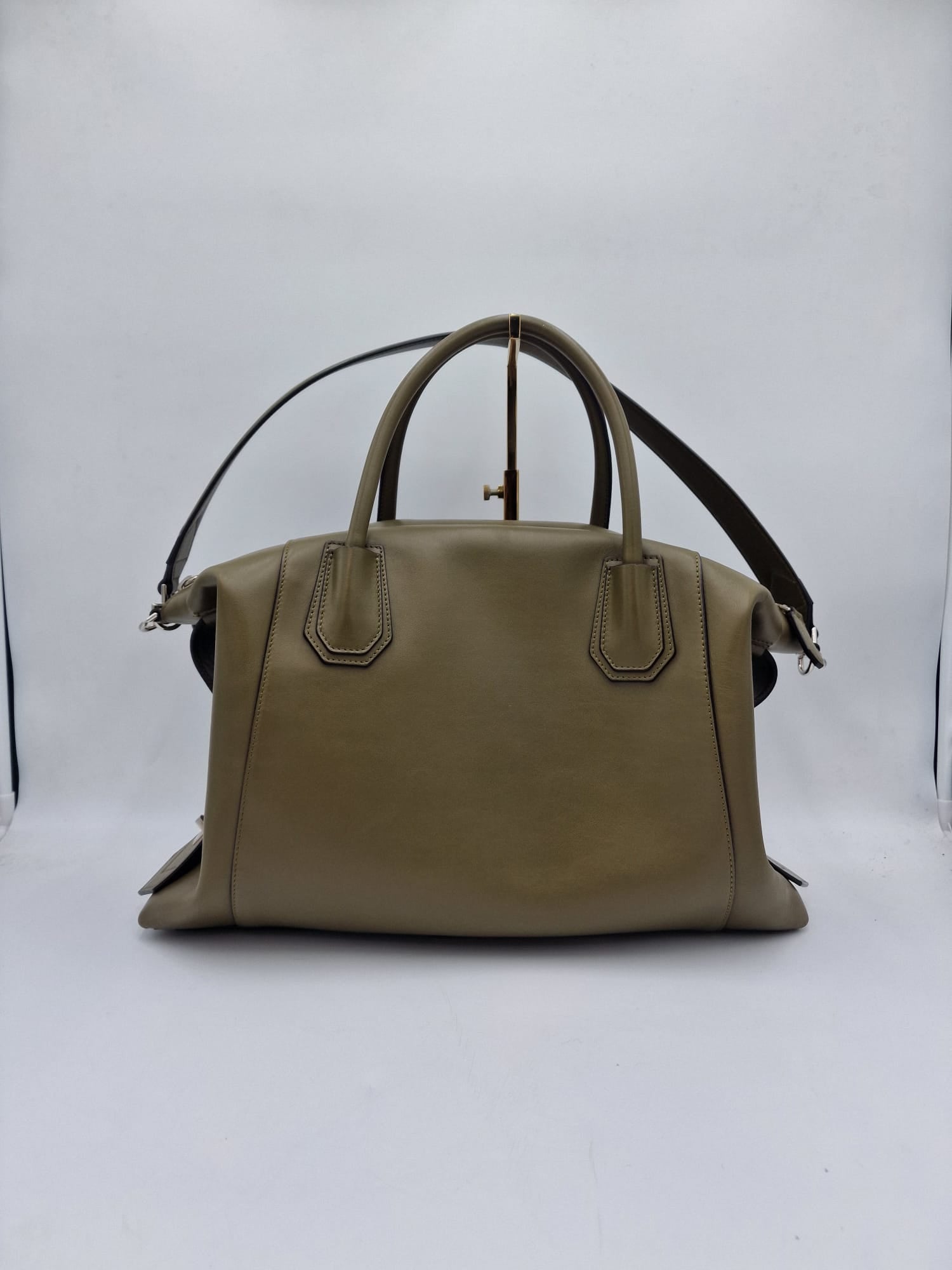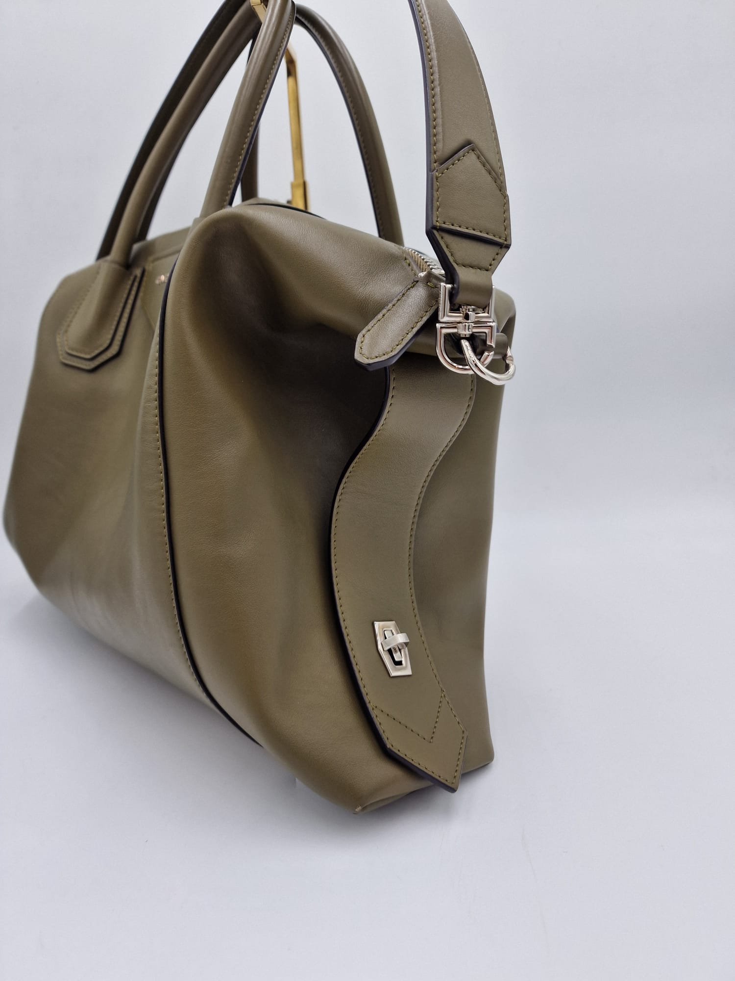 Givenchy Antigona Khaki Olive Green é uma mala inspirada na Antigona, uma figura poderosa da mitologia grega, e é um clássico da Givenchy. Em couro tem forma de trapézio com patch triangular GIVENCHY, fecho oversized e detalhes em metal. Tem dois bolsos planos e um bolso com fecho no interior.