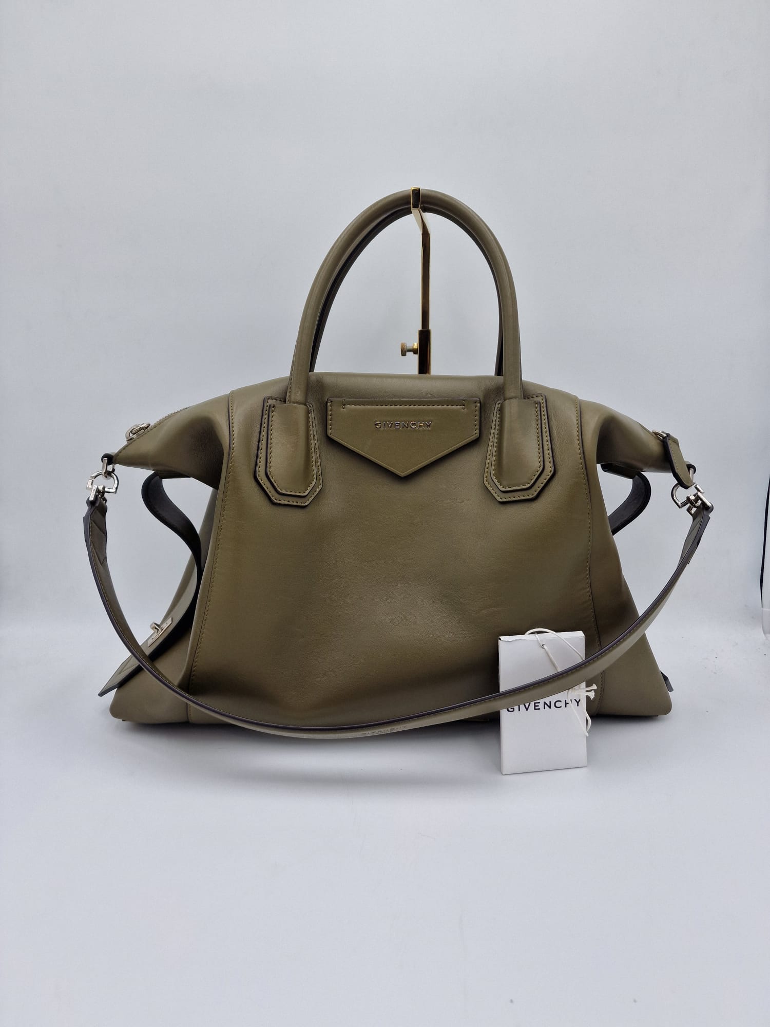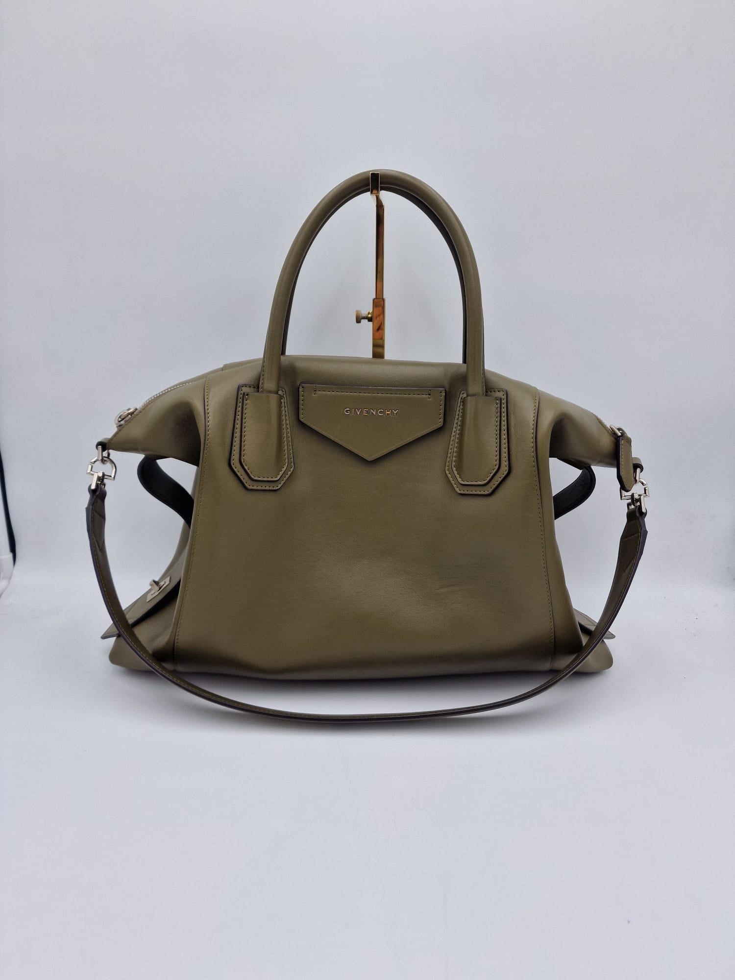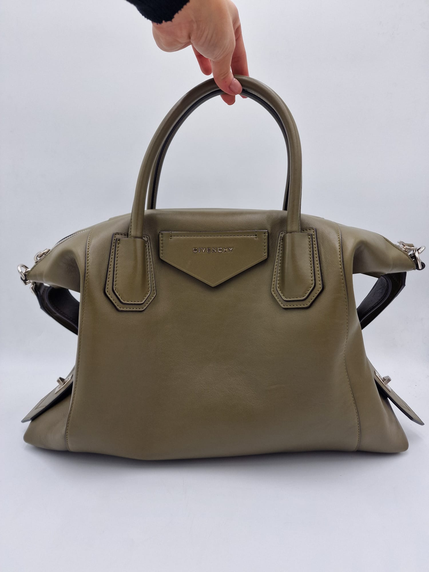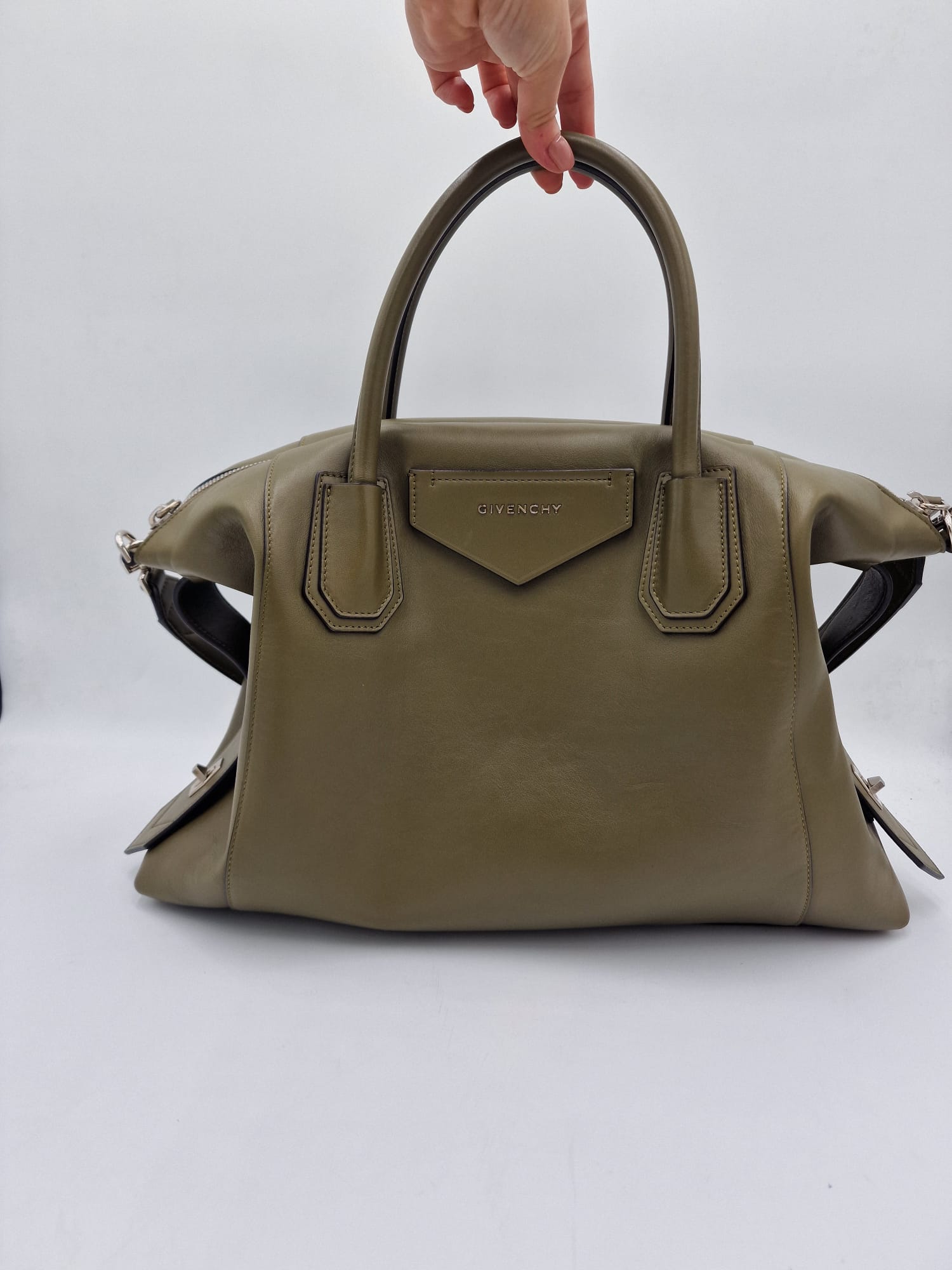 Givenchy Antigona Khaki Olive Green é uma mala inspirada na Antigona, uma figura poderosa da mitologia grega, e é um clássico da Givenchy. Em couro tem forma de trapézio com patch triangular GIVENCHY, fecho oversized e detalhes em metal. Tem dois bolsos planos e um bolso com fecho no interior.
