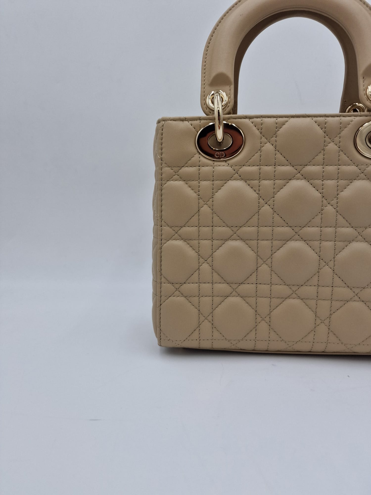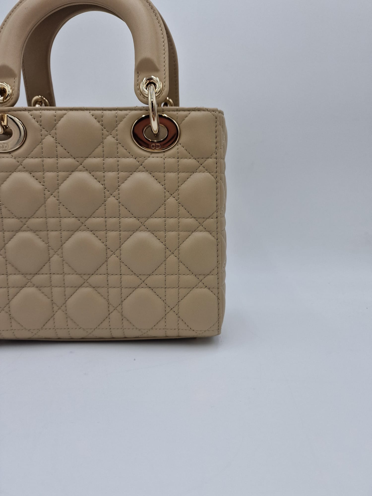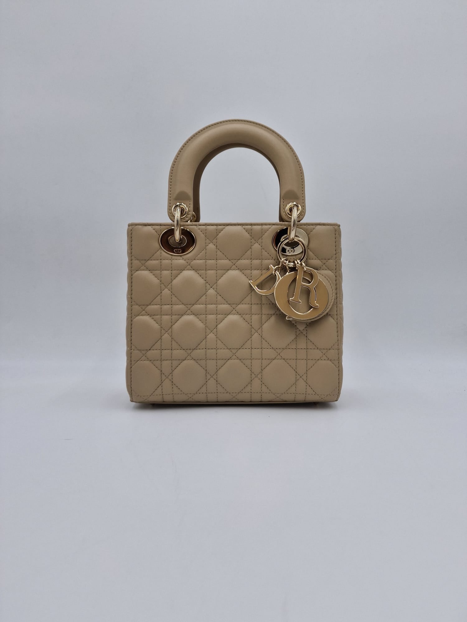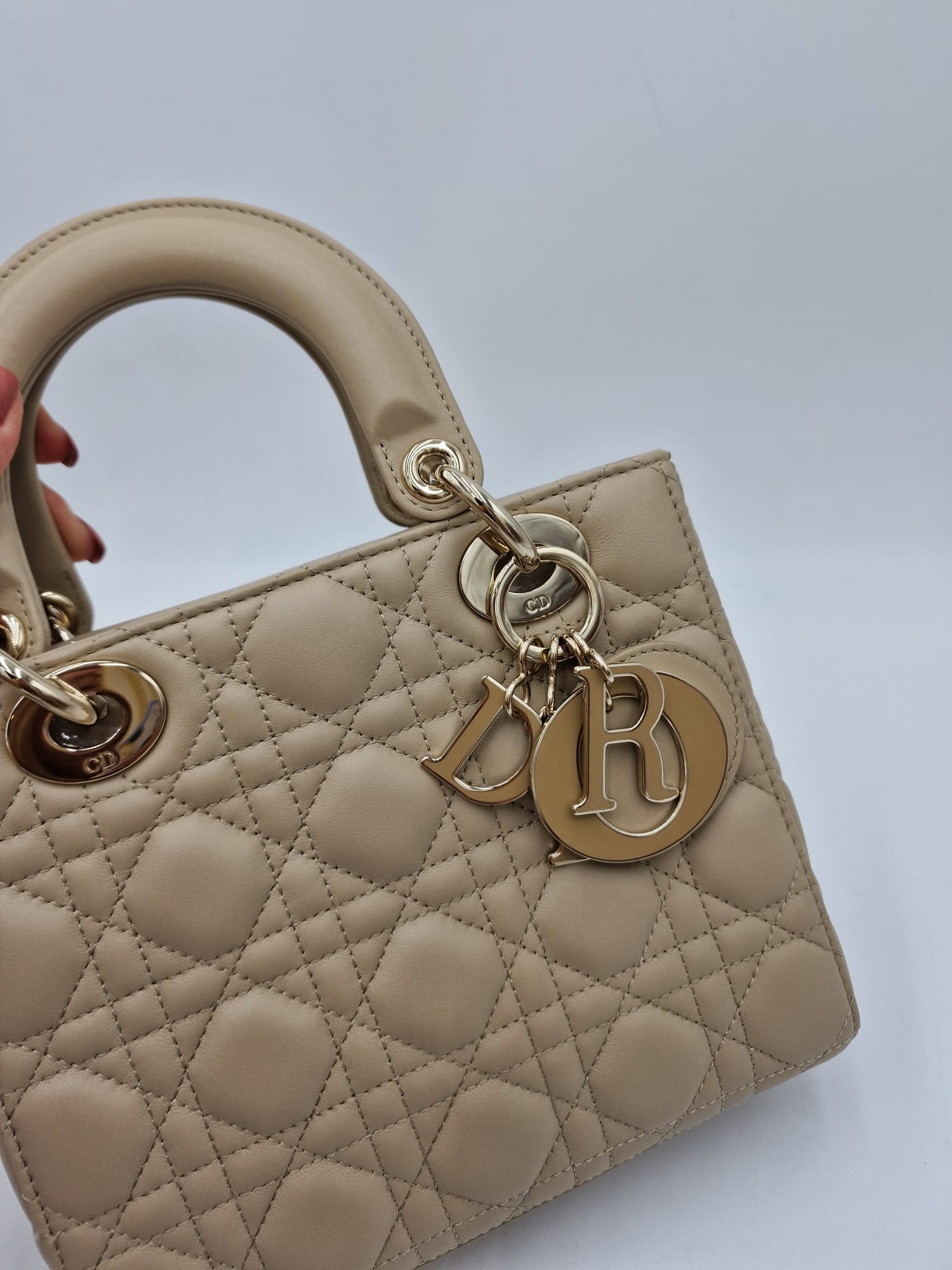 A bolsa Lady Dior personifica a visão de elegância e beleza da Maison. Elegante e refinado, o modelo intemporal é confeccionado em couro de bezerro bege com costuras Cannage, criando uma textura acolchoada instantaneamente reconhecível. Os charms D.I.O.R. exclusivos em metal com acabamento dourado embelezam e iluminam sua silhueta. Com uma alça de ombro fina e removível em couro, a pequena bolsa Lady Dior pode ser usada na mão ou transversal.