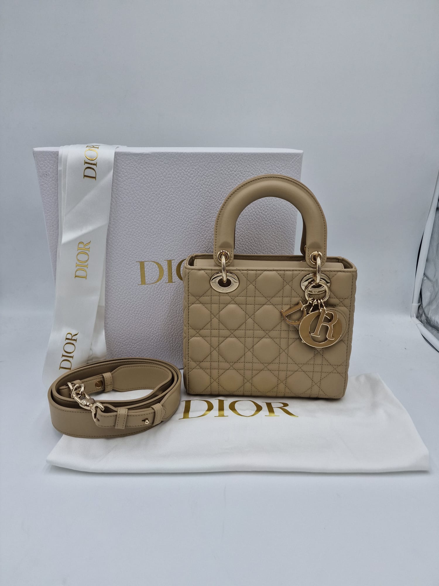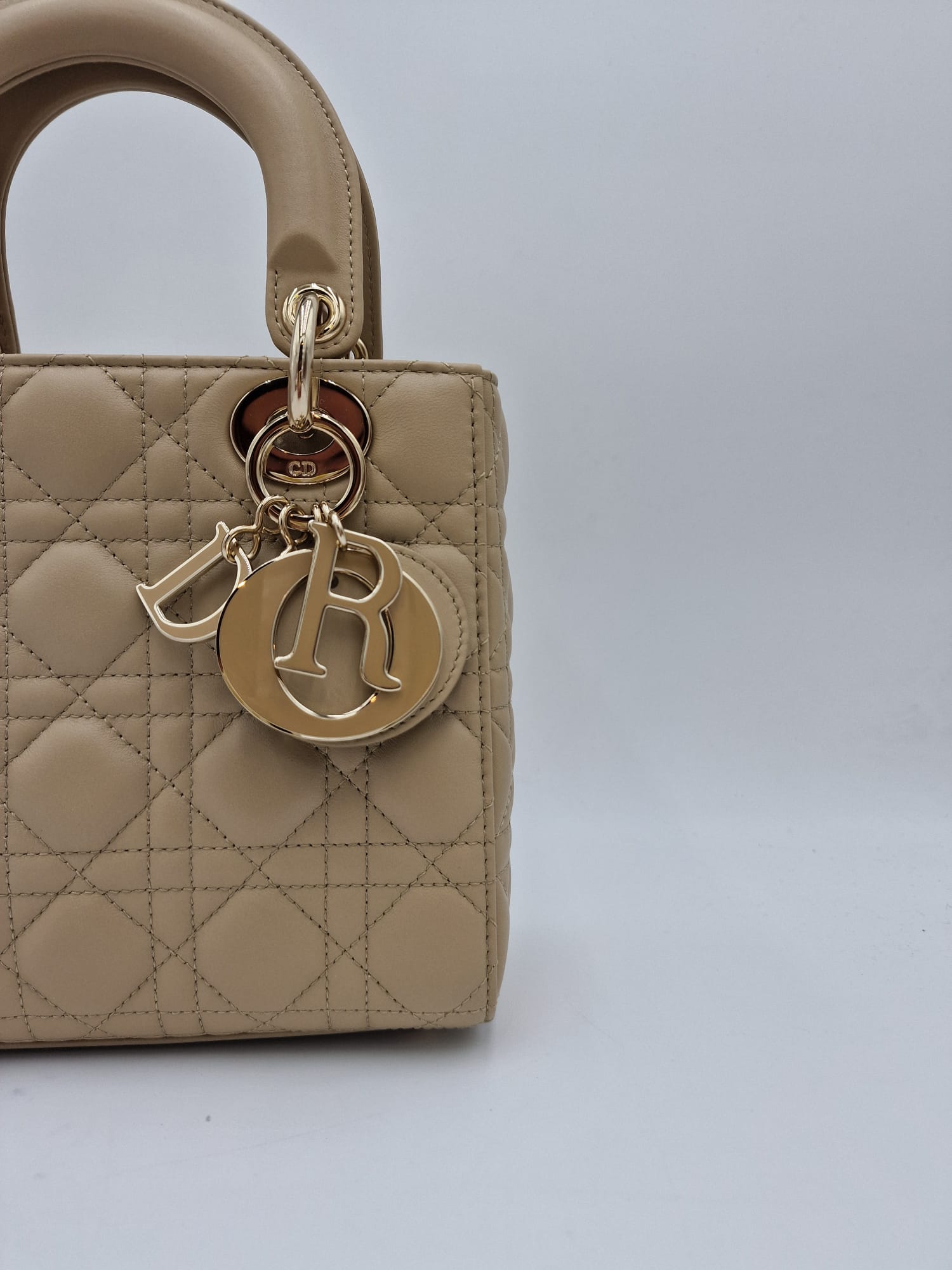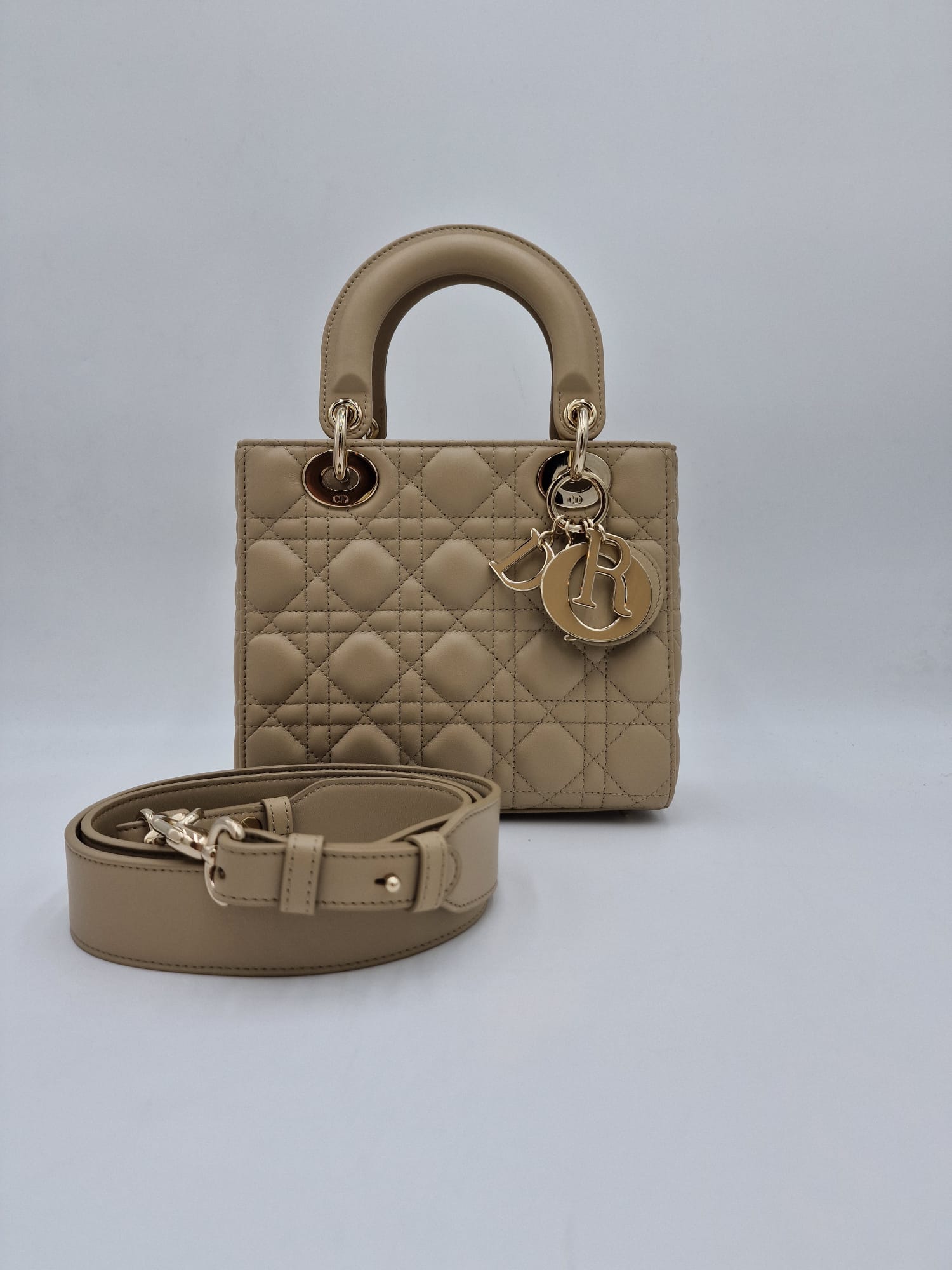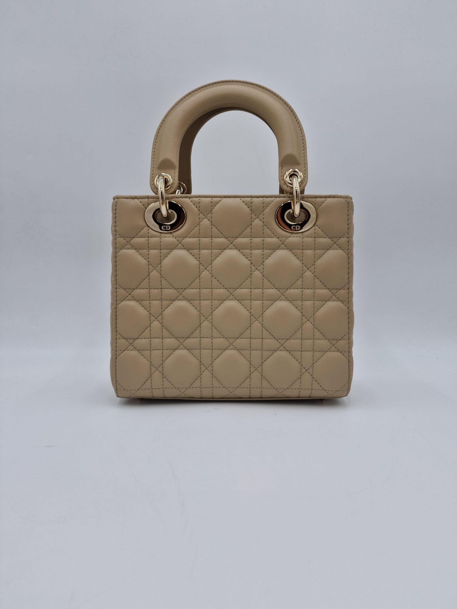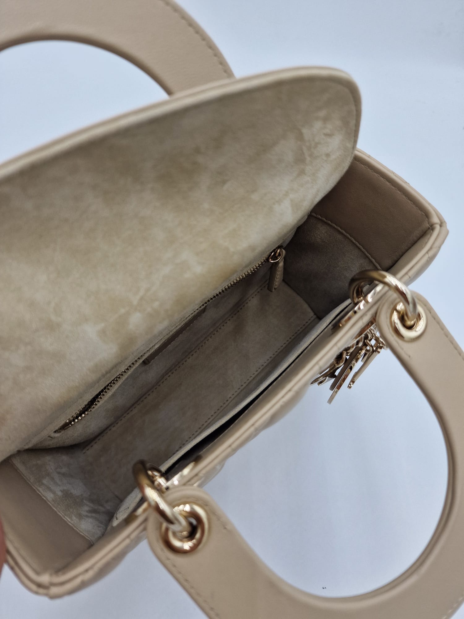 A bolsa Lady Dior personifica a visão de elegância e beleza da Maison. Elegante e refinado, o modelo intemporal é confeccionado em couro de bezerro bege com costuras Cannage, criando uma textura acolchoada instantaneamente reconhecível. Os charms D.I.O.R. exclusivos em metal com acabamento dourado embelezam e iluminam sua silhueta. Com uma alça de ombro fina e removível em couro, a pequena bolsa Lady Dior pode ser usada na mão ou transversal.