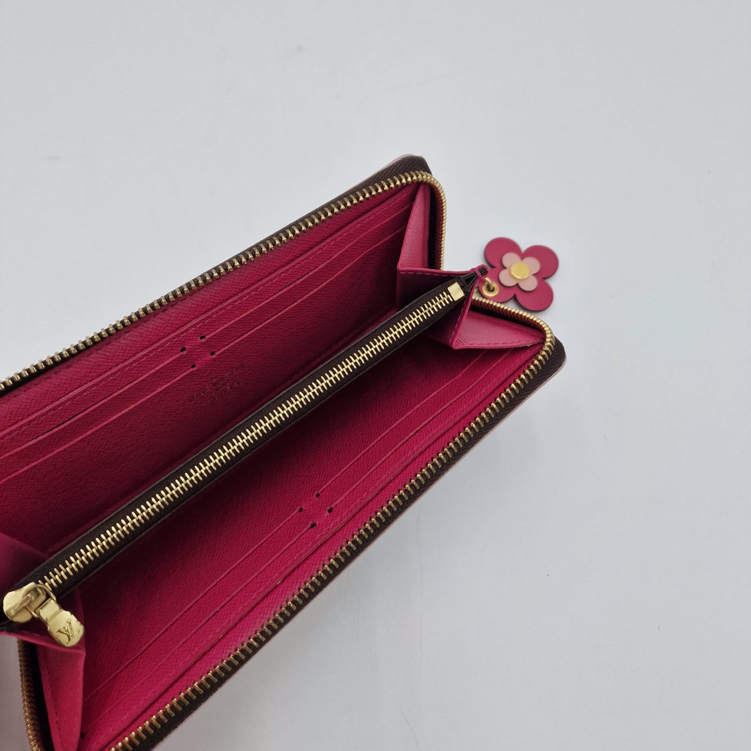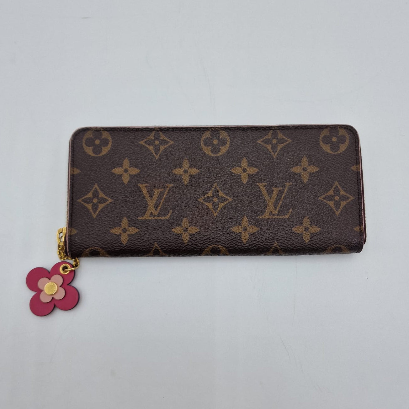 A carteira Clémence combina o histórico canvas Monogram da Louis Vuitton com um forro colorido em couro granulado. Este design fino abre-se para revelar um interior bem organizado com dois compartimentos grandes, um bolso para moedas com fecho e vários compartimentos para cartões. Com acabamento de fecho de flor, também pode ser usada como clutch.