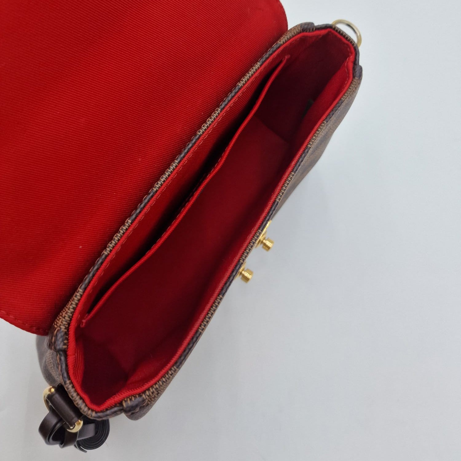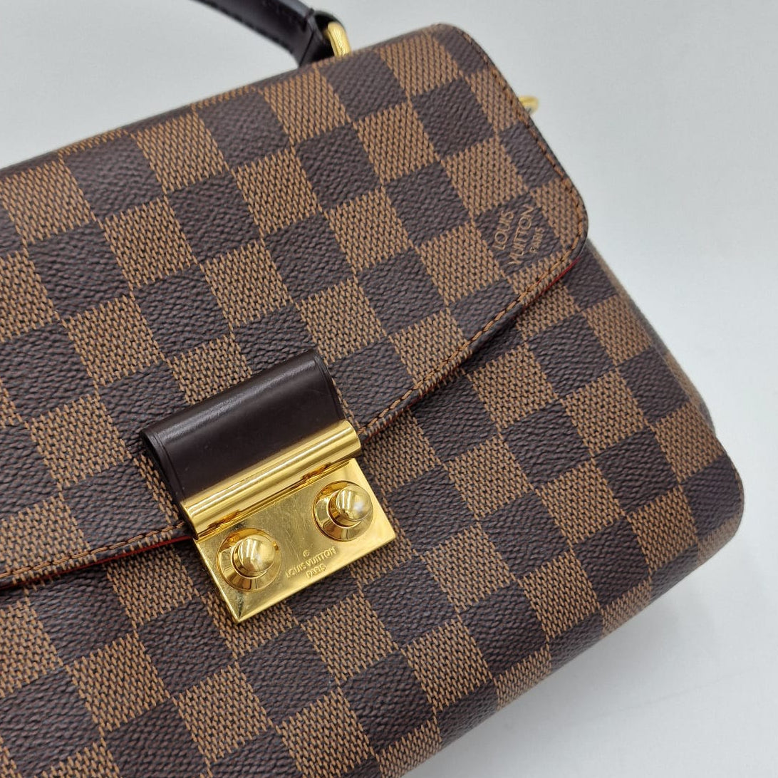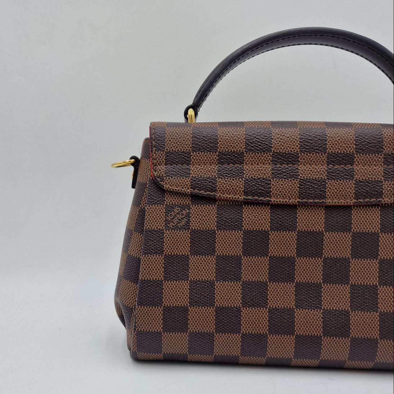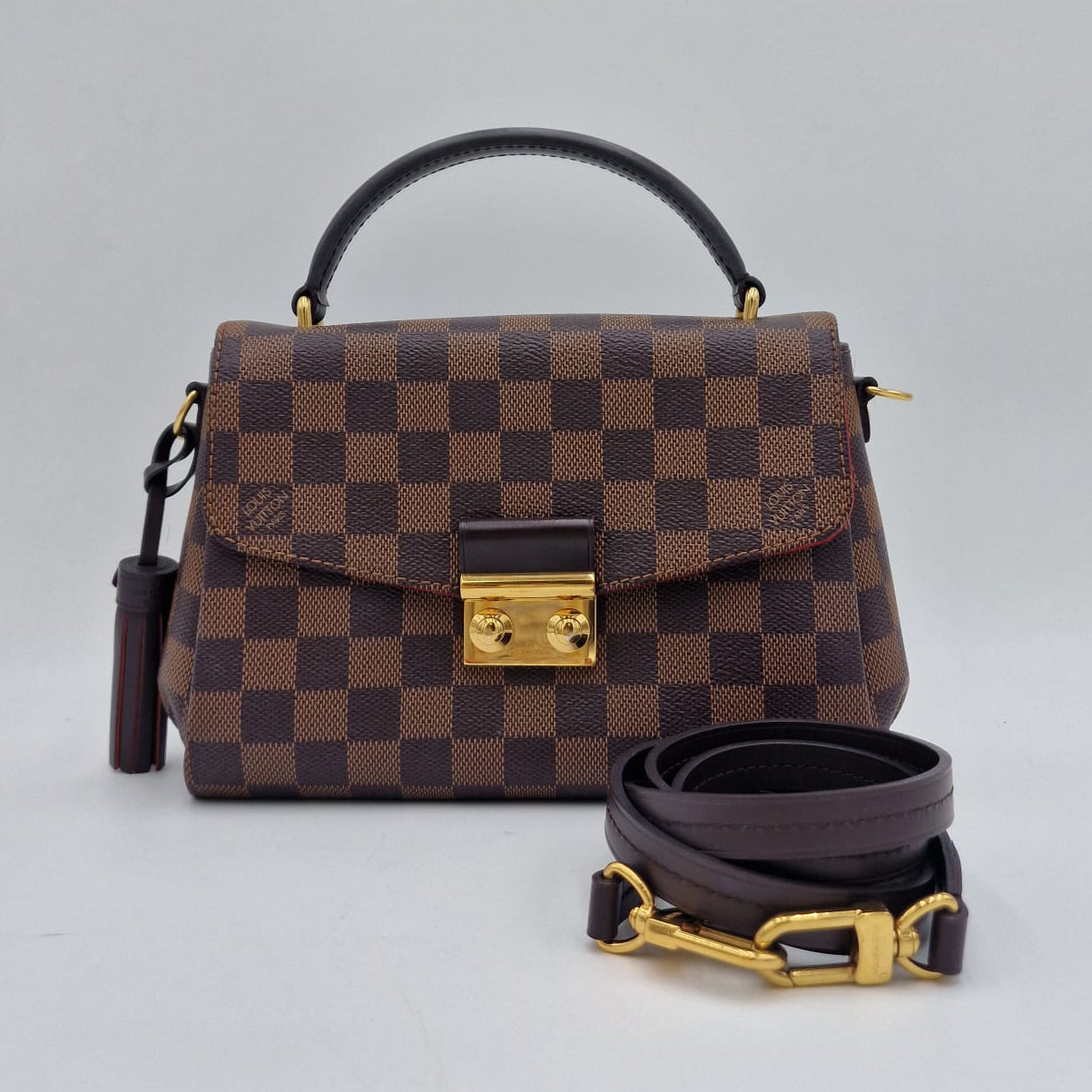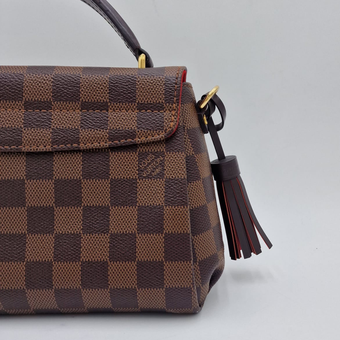 Compacta e com design moderno, a bolsa Croisette em canvas Damier Ebene exibe detalhes sofisticados como o fecho S-lock e um estilo casual chic. Apresenta hardware dourado e o pompom removível em couro traz um toque divertido.