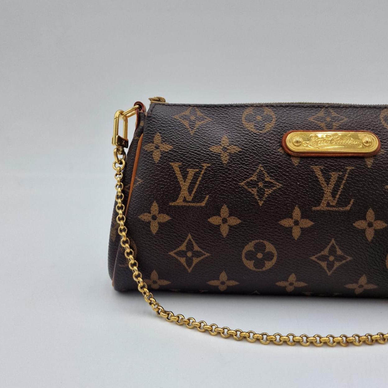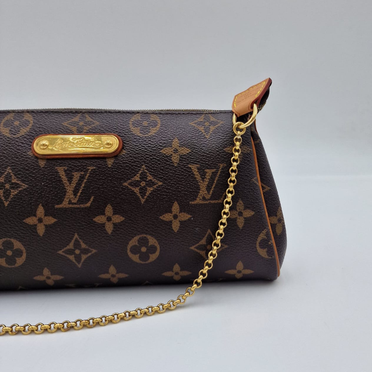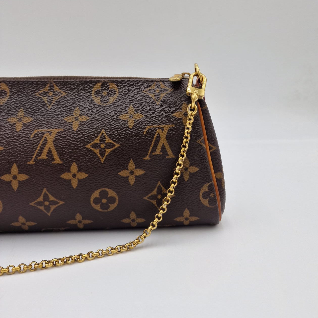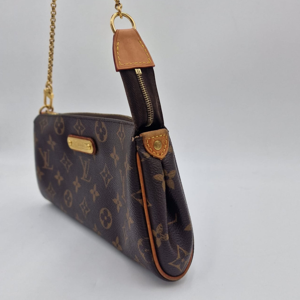 A Louis Vuitton Eva Monogram é uma clutch com corrente dourada em tela monograma, hardware dourado com o logo e uma alça removível em pele. É uma mala versátil, sendo possível utilizar como clutch apenas com a corrente dourada, ou como mala crossbody, com a alça de pele e a corrente como pormenor.