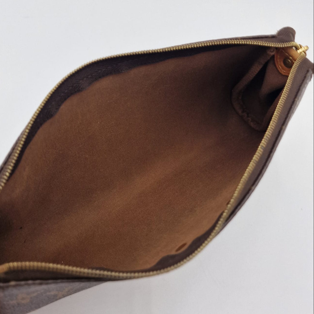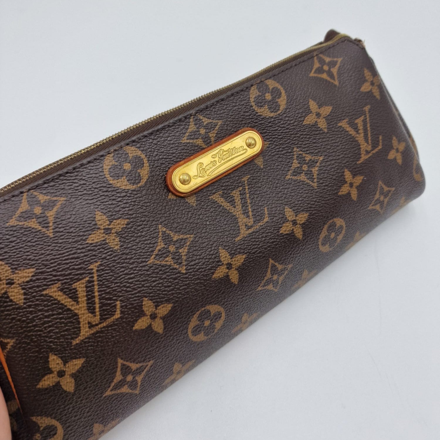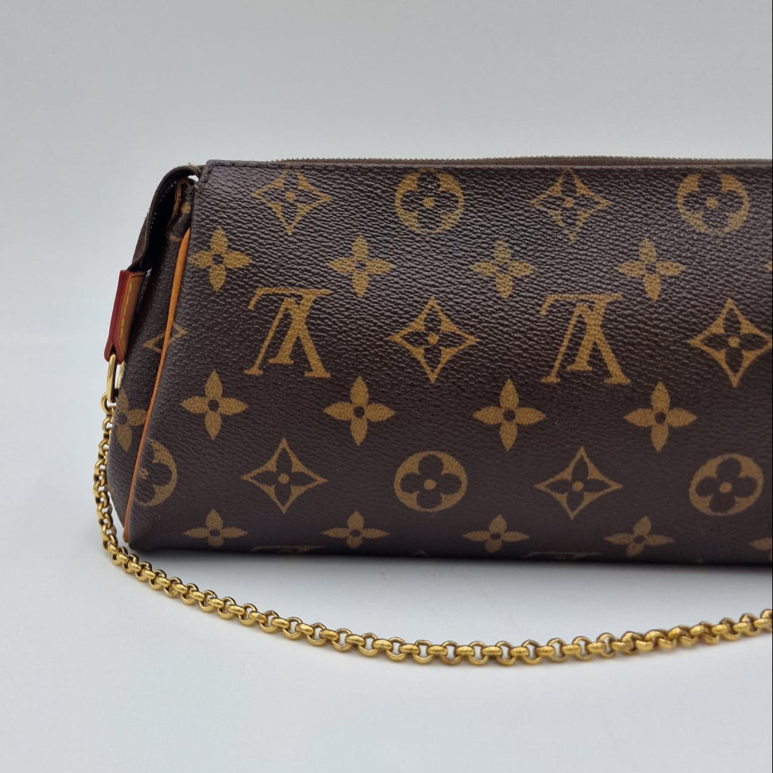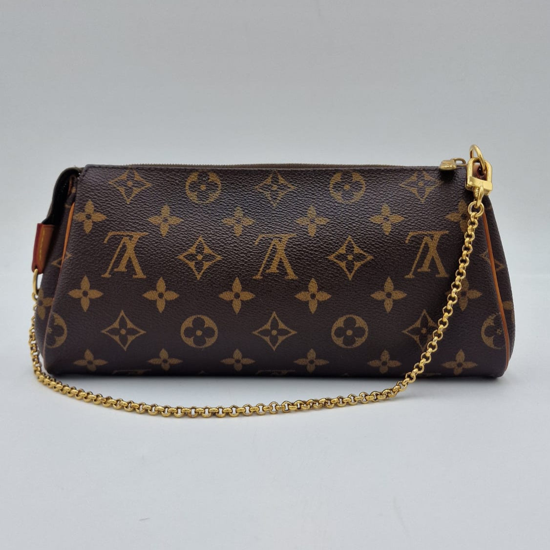 A Louis Vuitton Eva Monogram é uma clutch com corrente dourada em tela monograma, hardware dourado com o logo e uma alça removível em pele. É uma mala versátil, sendo possível utilizar como clutch apenas com a corrente dourada, ou como mala crossbody, com a alça de pele e a corrente como pormenor.