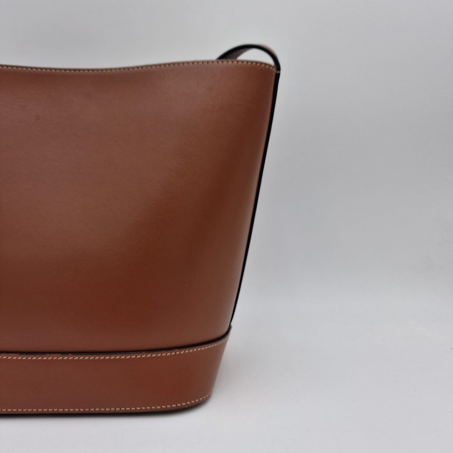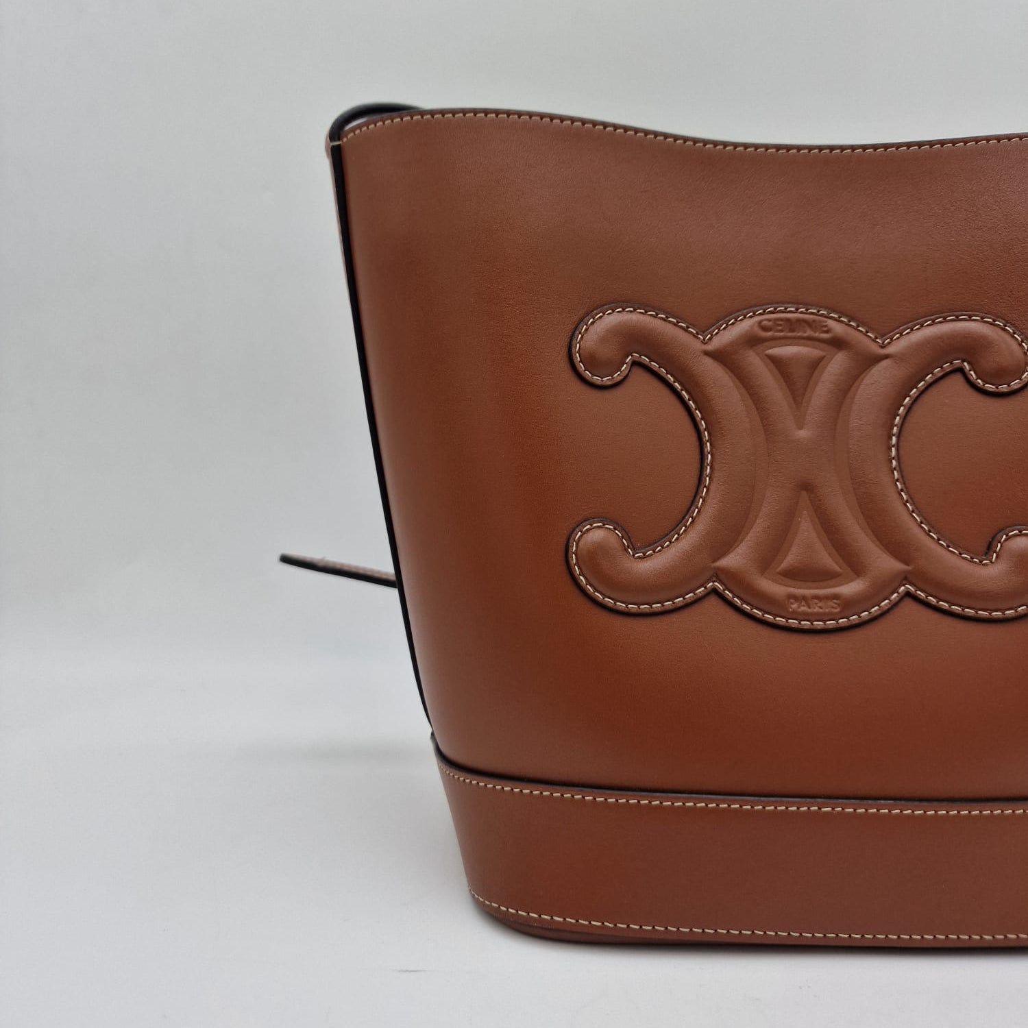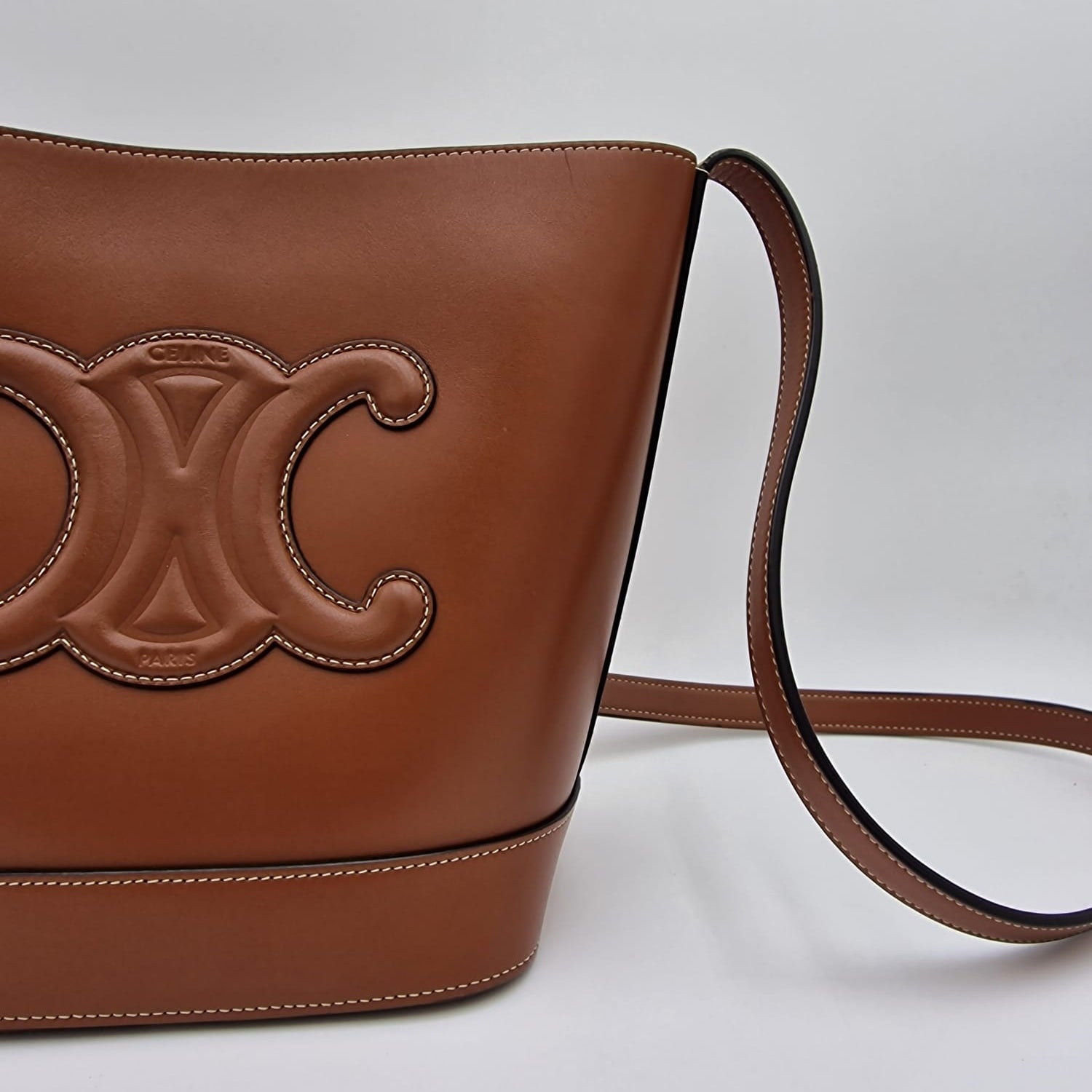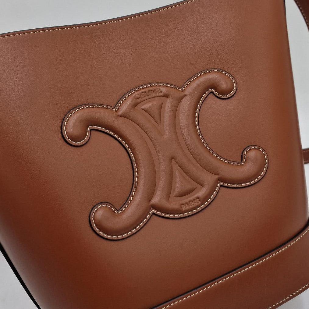 Celine Triomphe Bucket em couro de vitelo e forro em couro de vitelo em camurça. Possui hardware dourado e alça ajustável para carregar ao ombro ou à tiracolo!