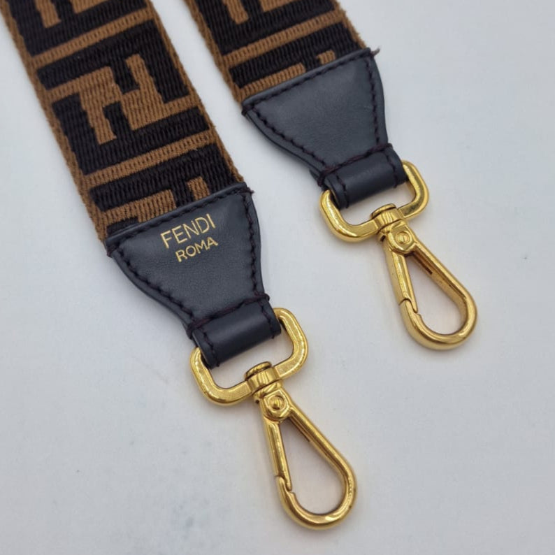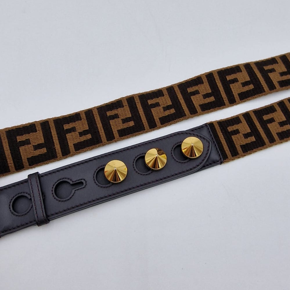 Alça de ombro longa e ajustável com dois ganchos de pressão, para uso com qualquer bolsa com ganchos. Confeccionada em trançado com motivos FF castanho e preto. Decorada com detalhes em couro preto e spikes dourados.