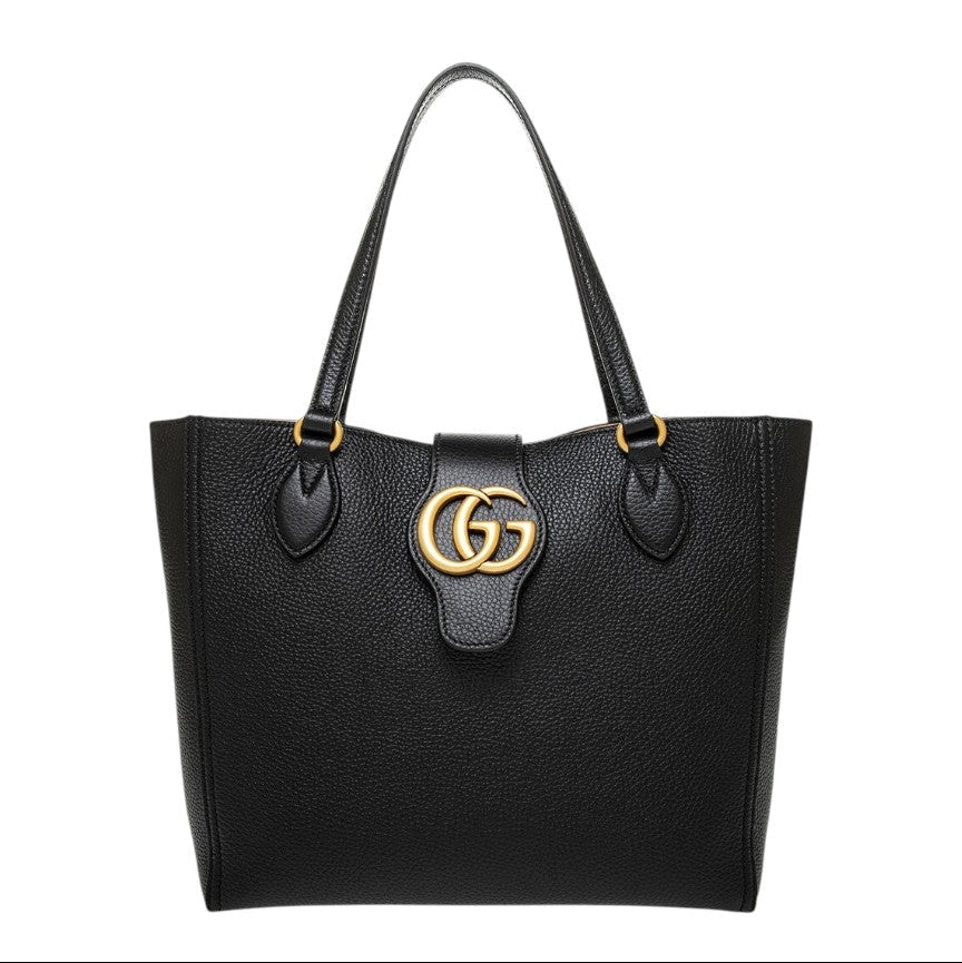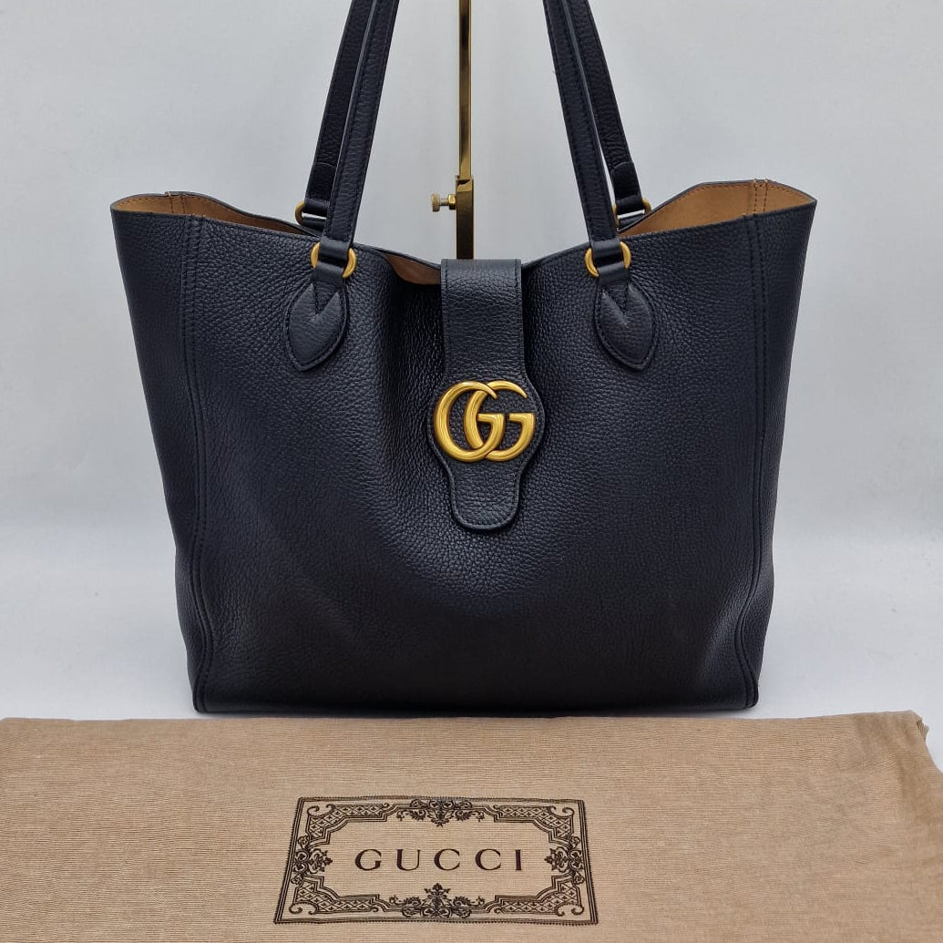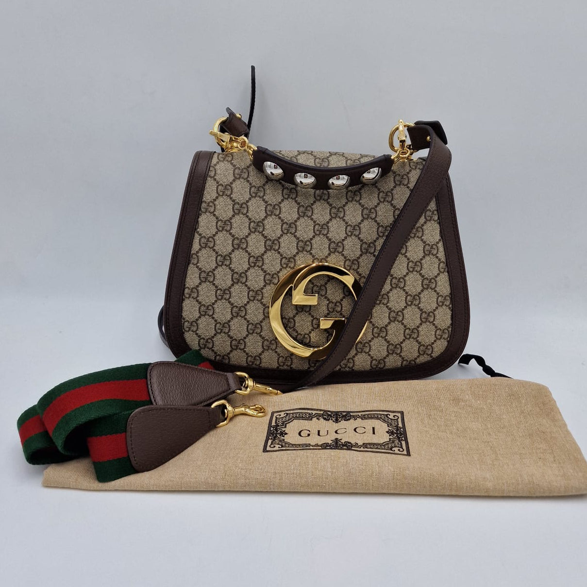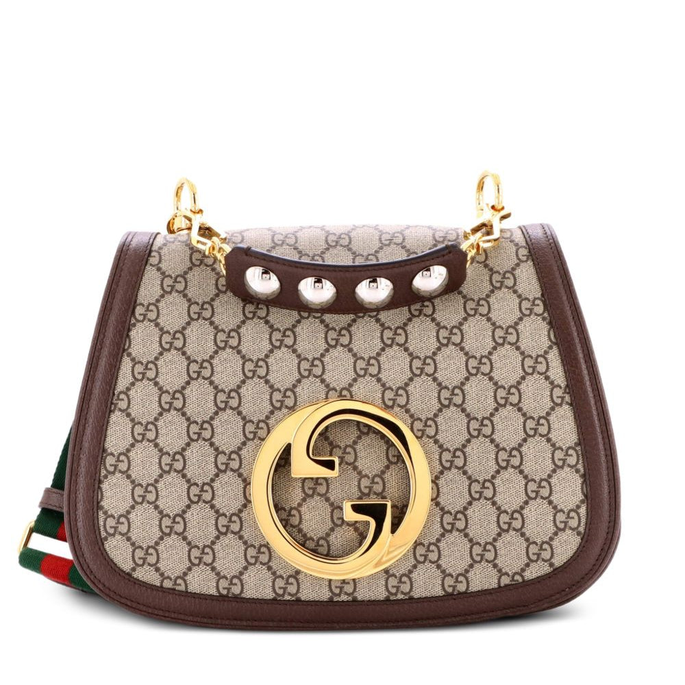A Gucci Dolar é uma bolsa estruturada confeccionada em couro bege escuro. Possui uma alça de mão em couro e uma alça de ombro em corrente. A aba frontal tem fecho de encaixe G-lock dourado e bolsos internos com fechos