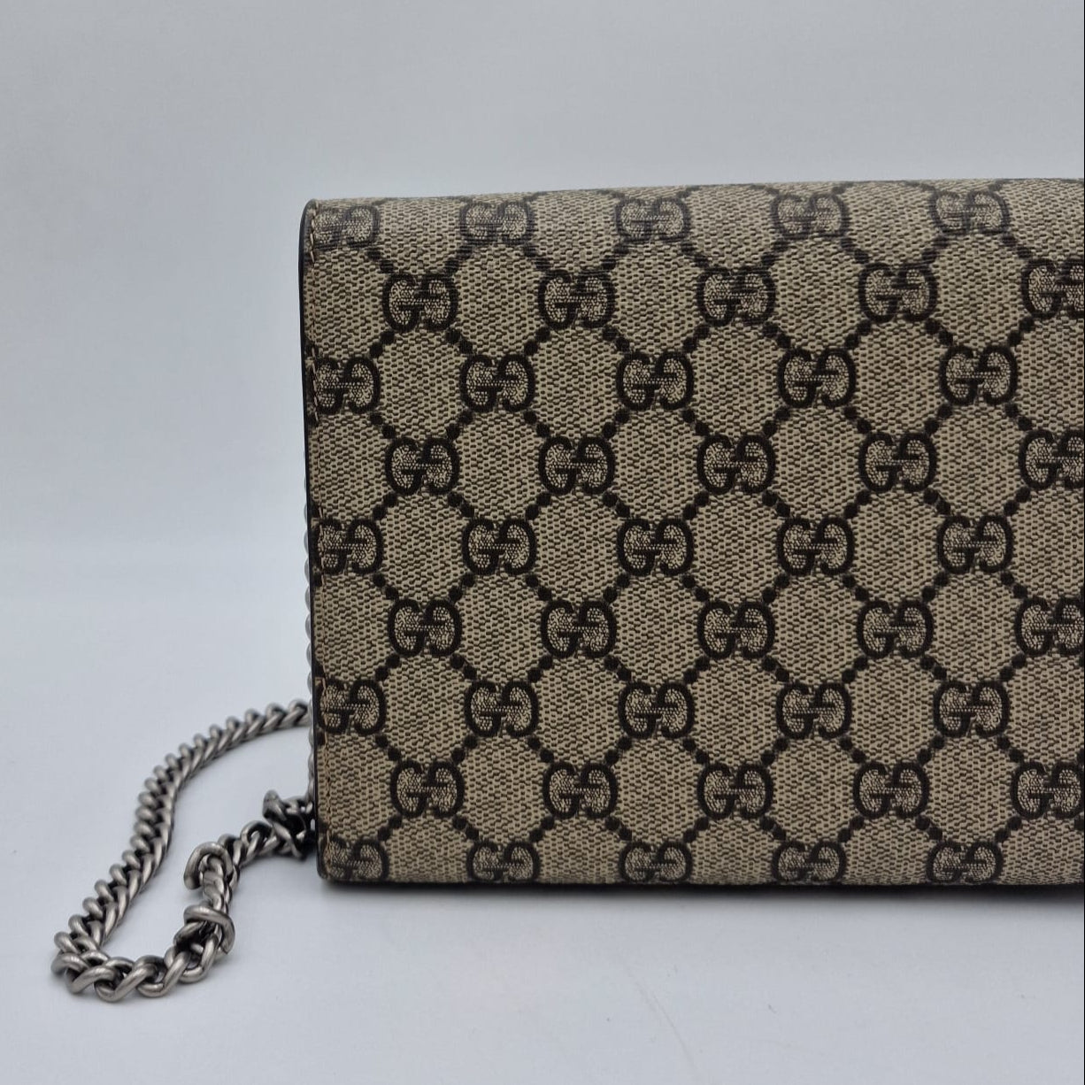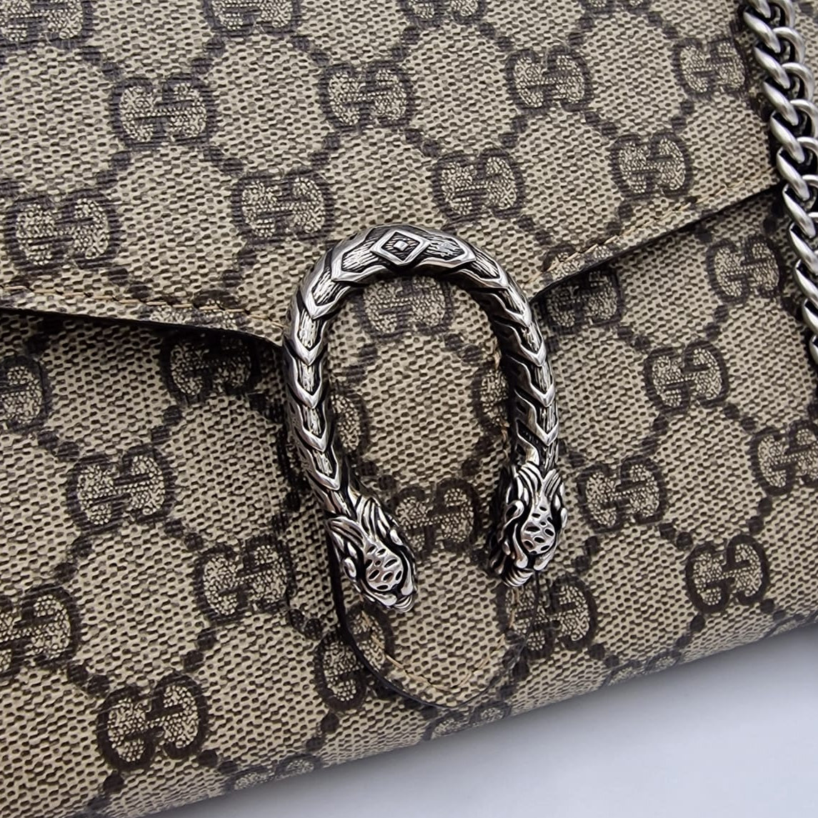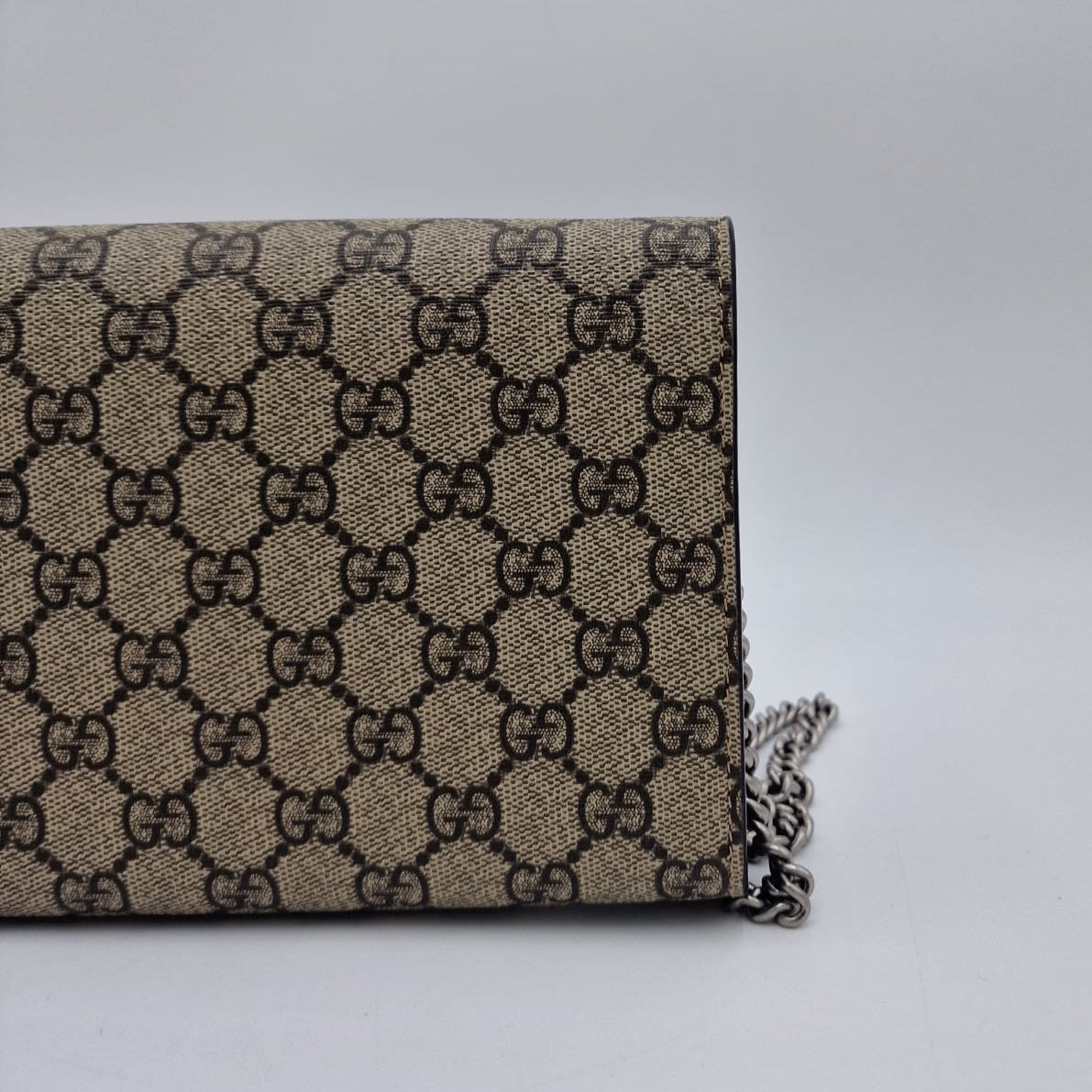 A Gucci Dionysus Supreme WOC é uma bolsa de lona GG Supreme. Possui alça de corrente! Tem o fecho texturizado de espora de cabeça de tigre - um detalhe único que faz referência ao deus grego Dionísio.