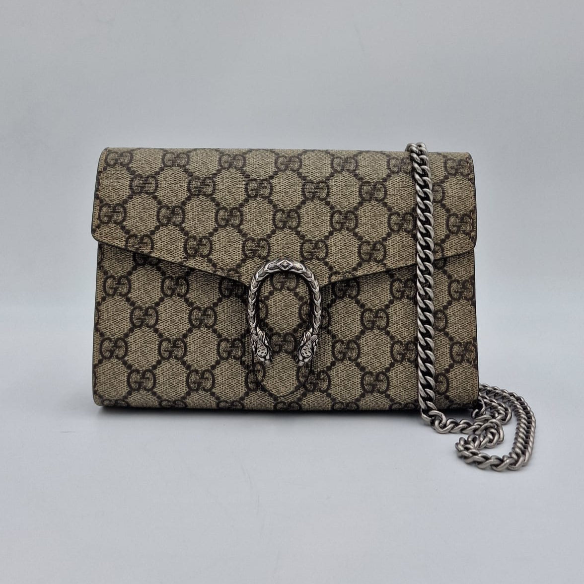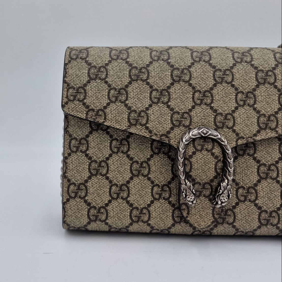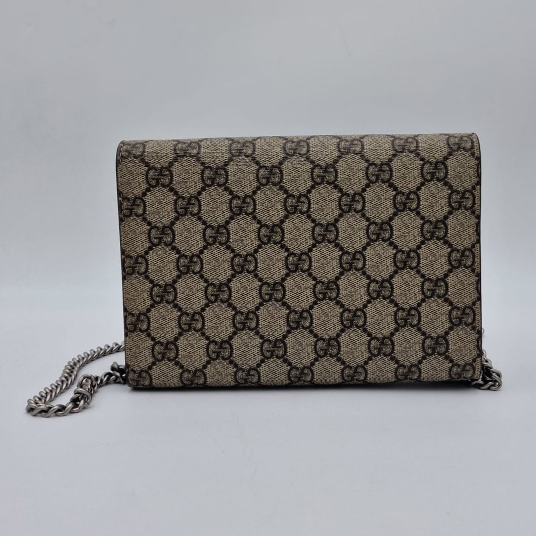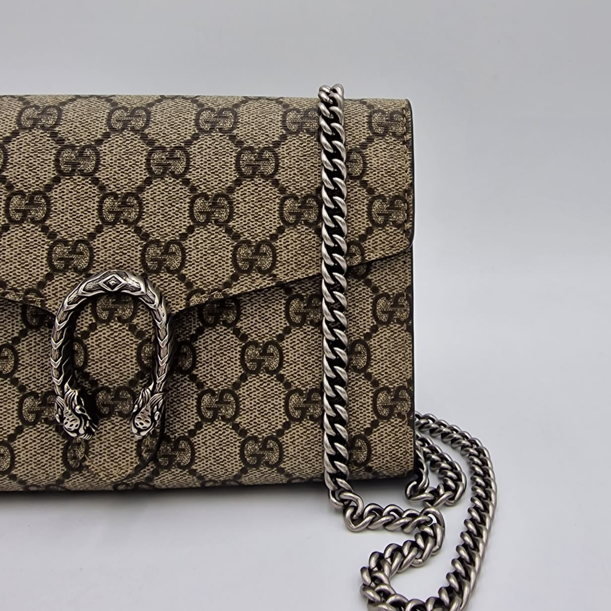 A Gucci Dionysus Supreme WOC é uma bolsa de lona GG Supreme. Possui alça de corrente! Tem o fecho texturizado de espora de cabeça de tigre - um detalhe único que faz referência ao deus grego Dionísio.