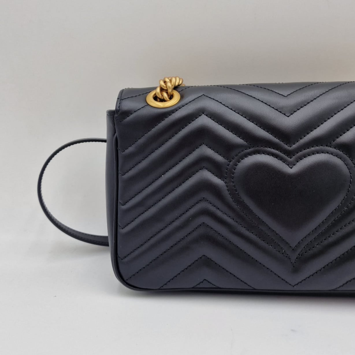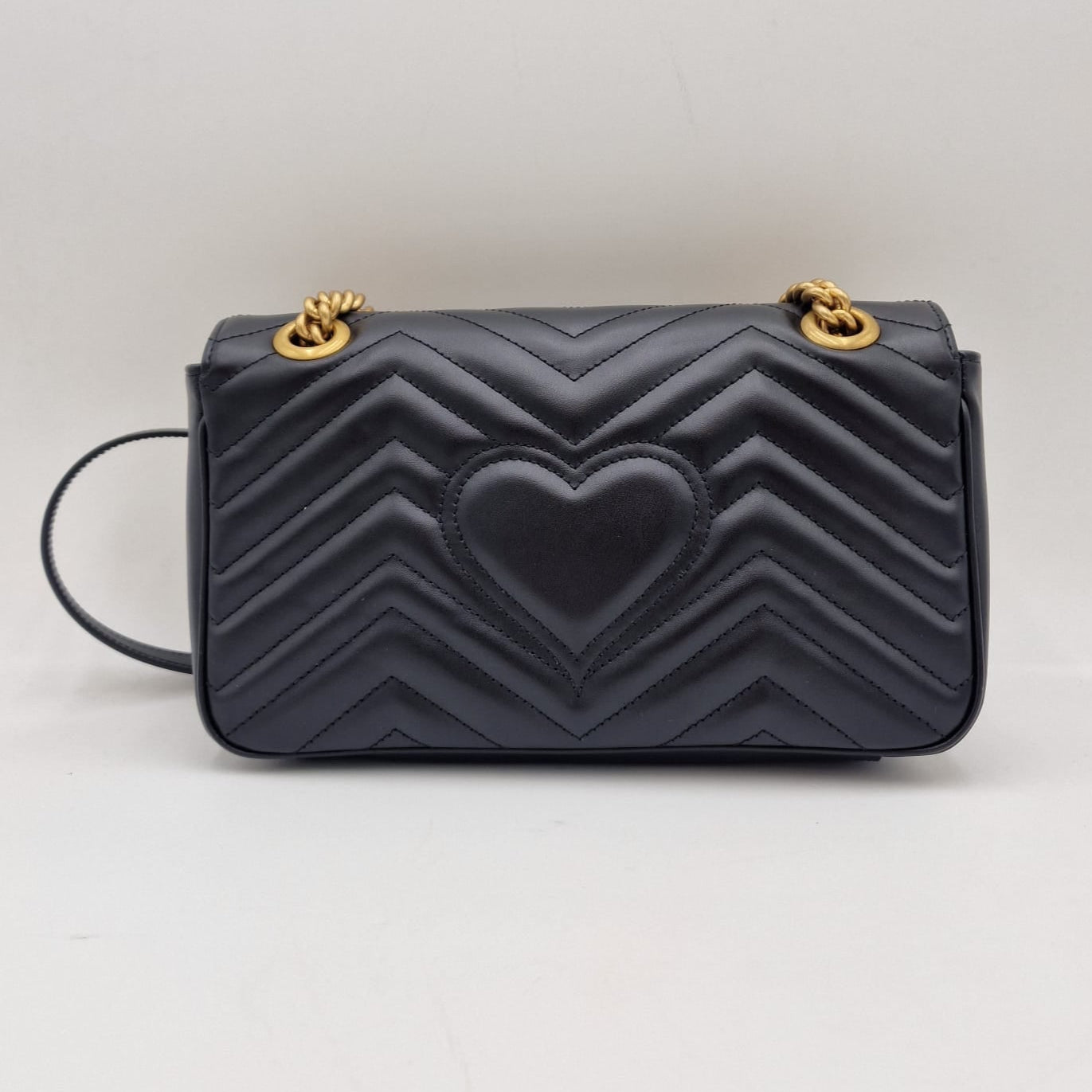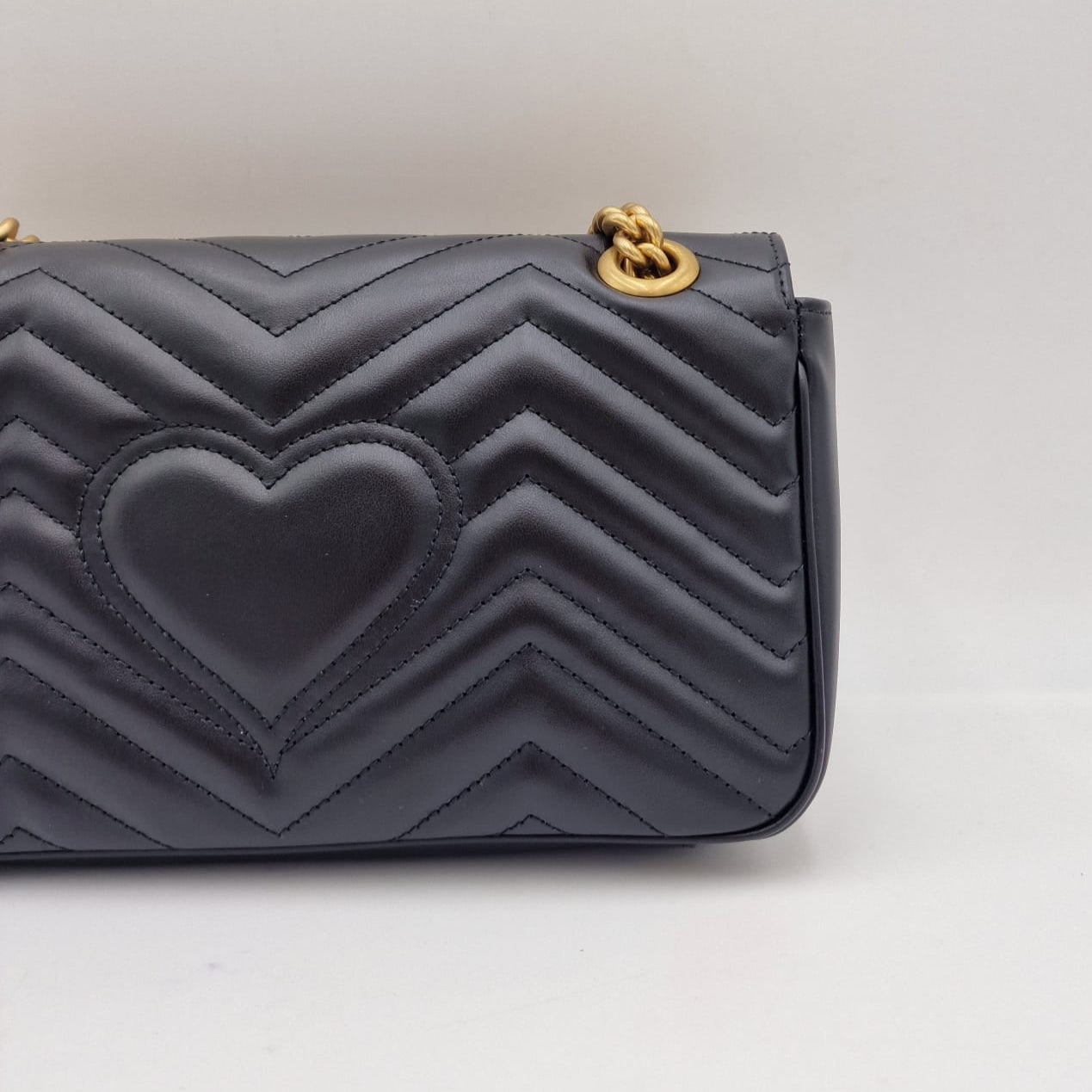 Confeccionada em couro matelassê chevron com coração nas costas.