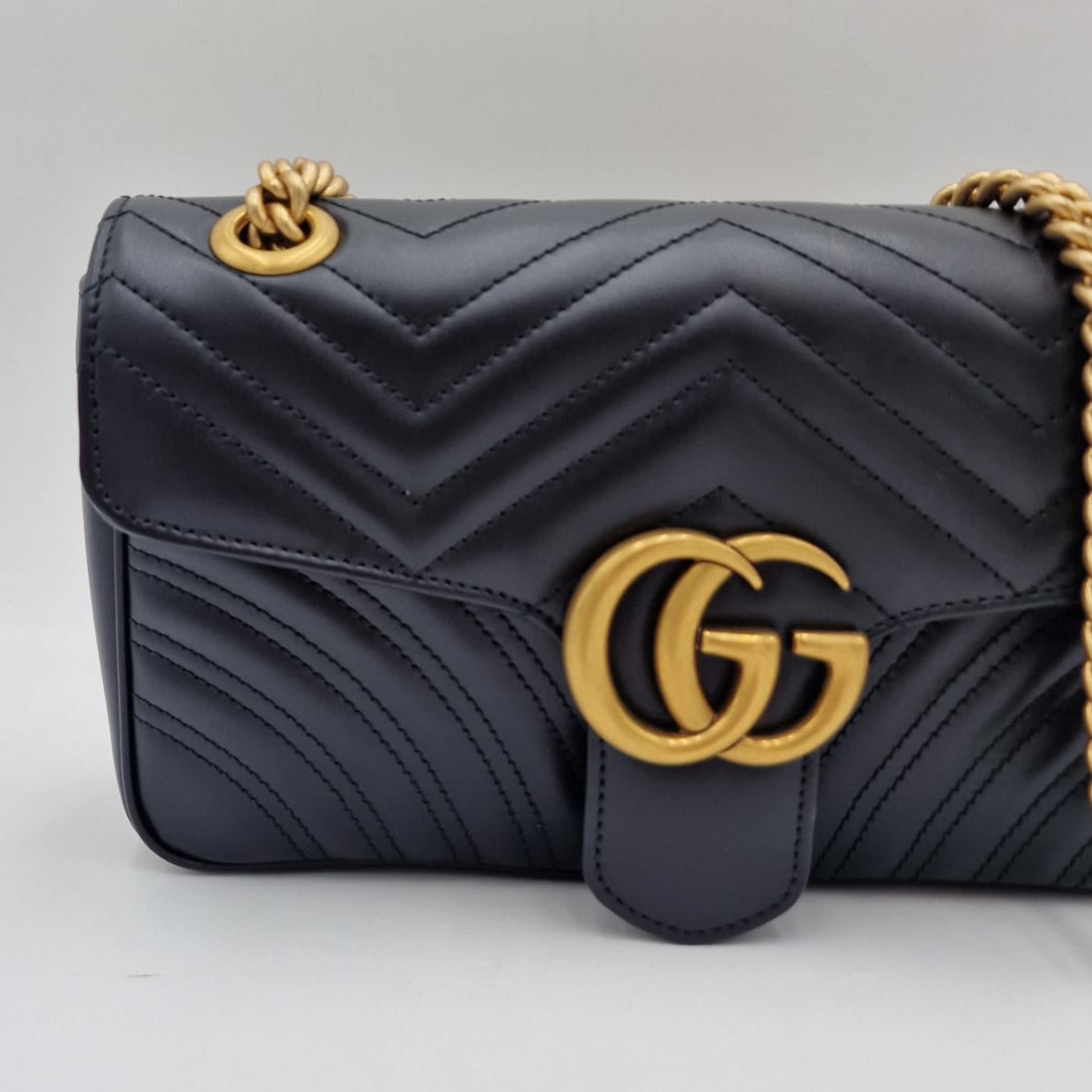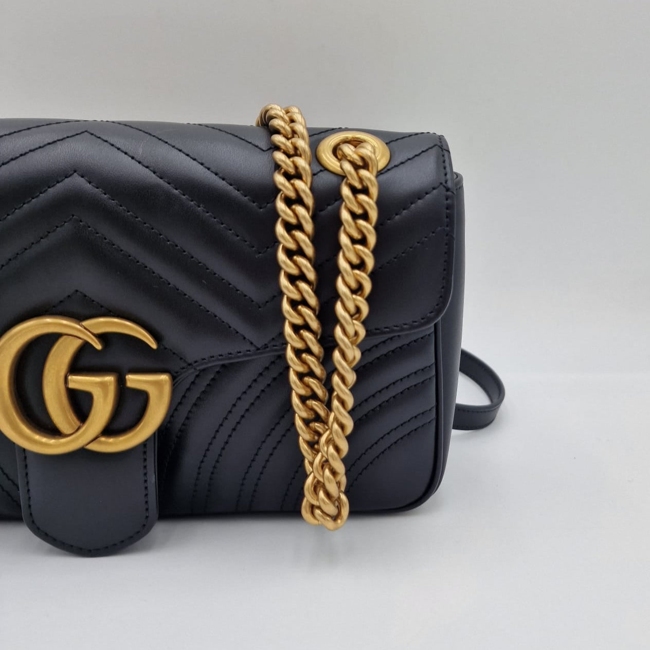 A Gucci GG Marmont tem um formato suavemente estruturado e fecho com aba oversized e ferragem dourada GG. A alça de corrente deslizante pode ser usada de várias maneiras, alternando entre uma bolsa de ombro e uma bolsa com alça superior.