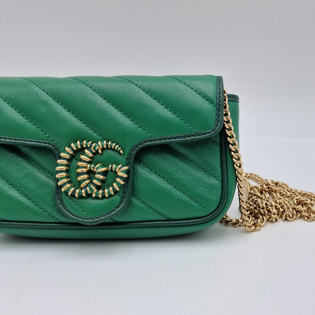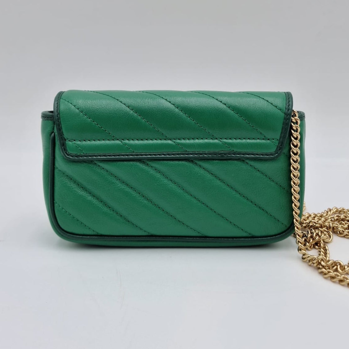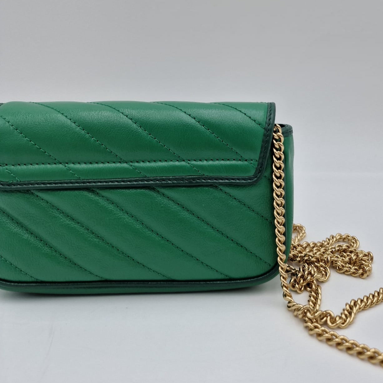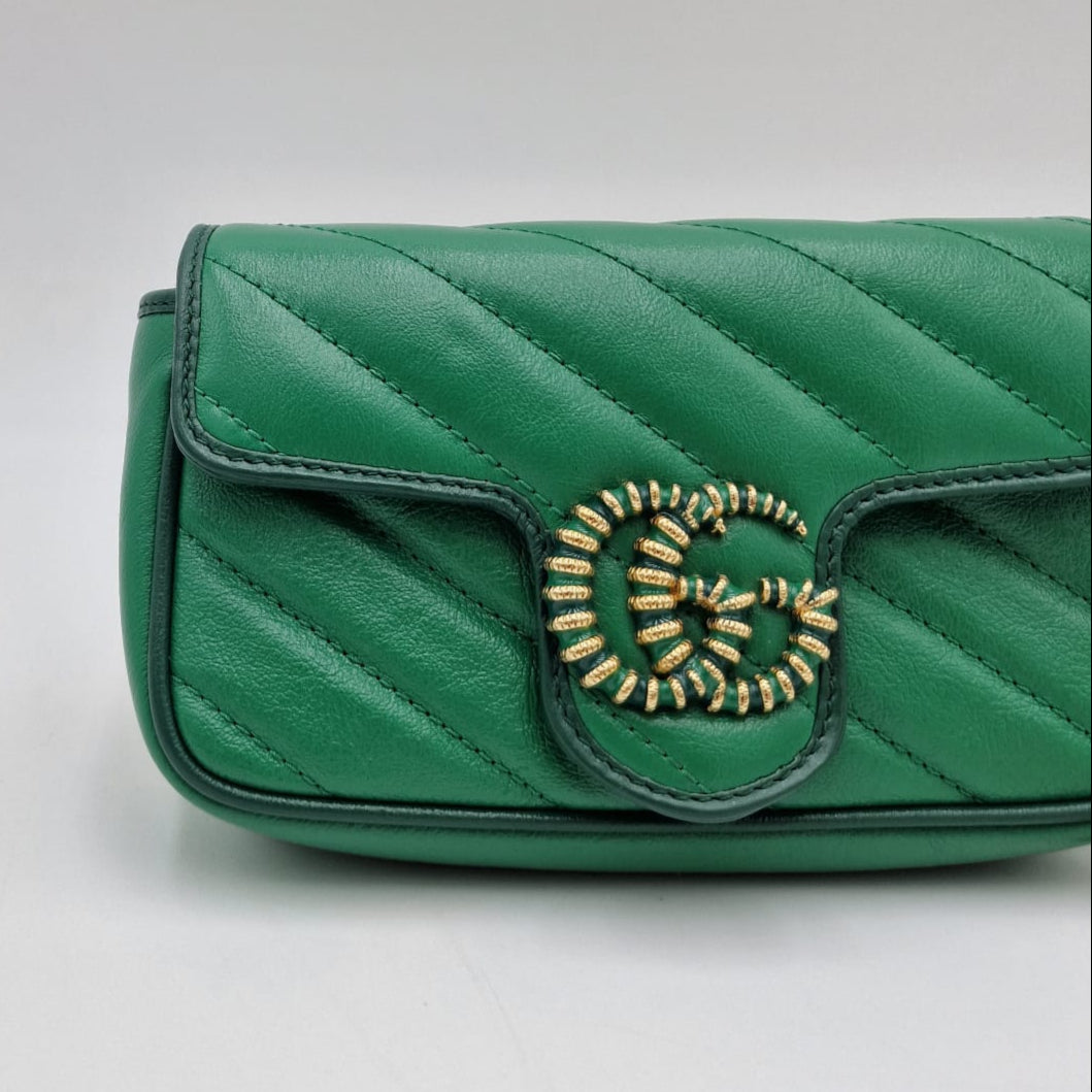 A GG Marmont Super Mini possui um chaveiro que pode ser usado para prendê-la a uma bolsa maior separada. Possui um formato levemente estruturado e fecha com aba em detalhe Duplo G. O hardware é inspirado num design de arquivo dos anos 70. Confecionada em couro chevron matelassé, é uma mala icónica!