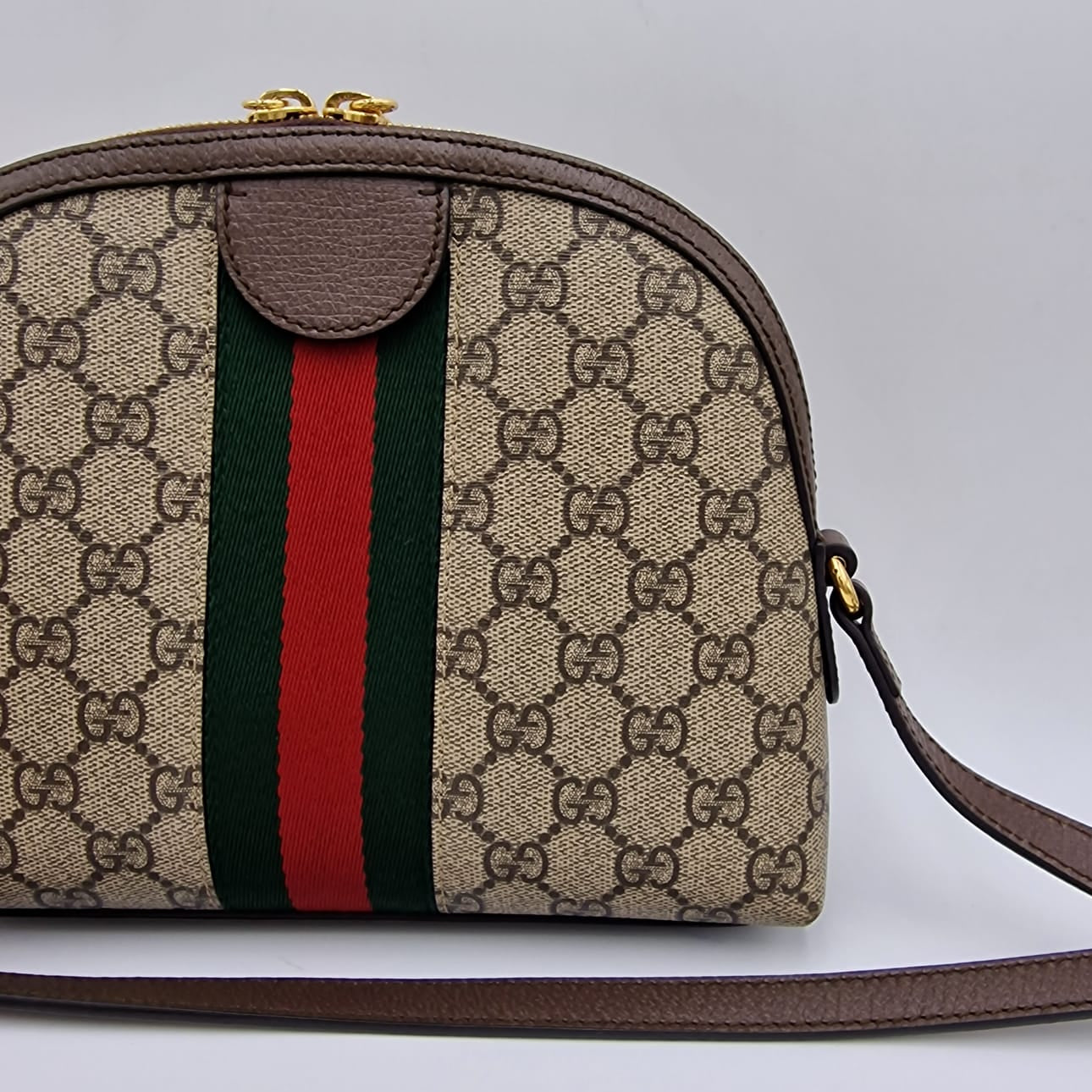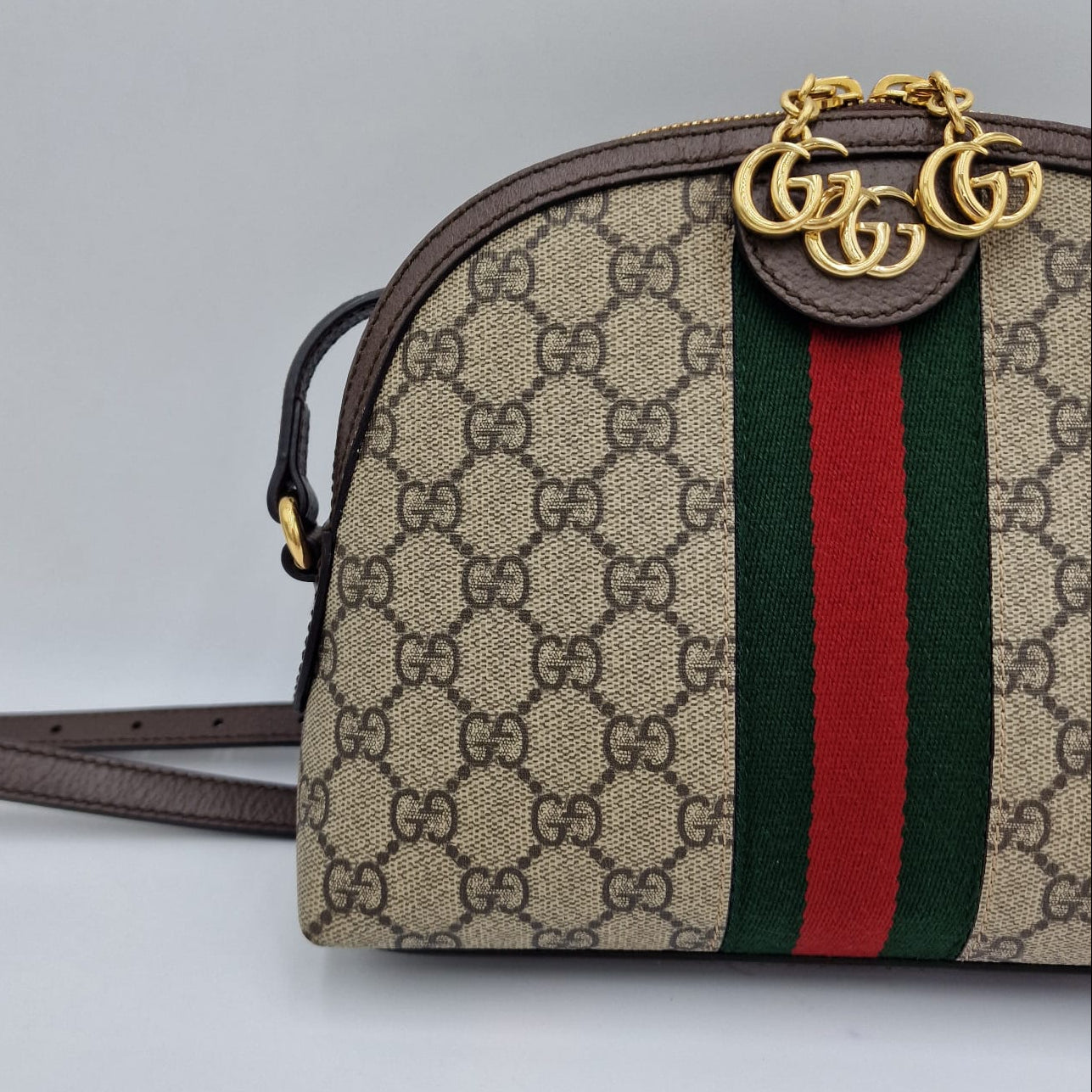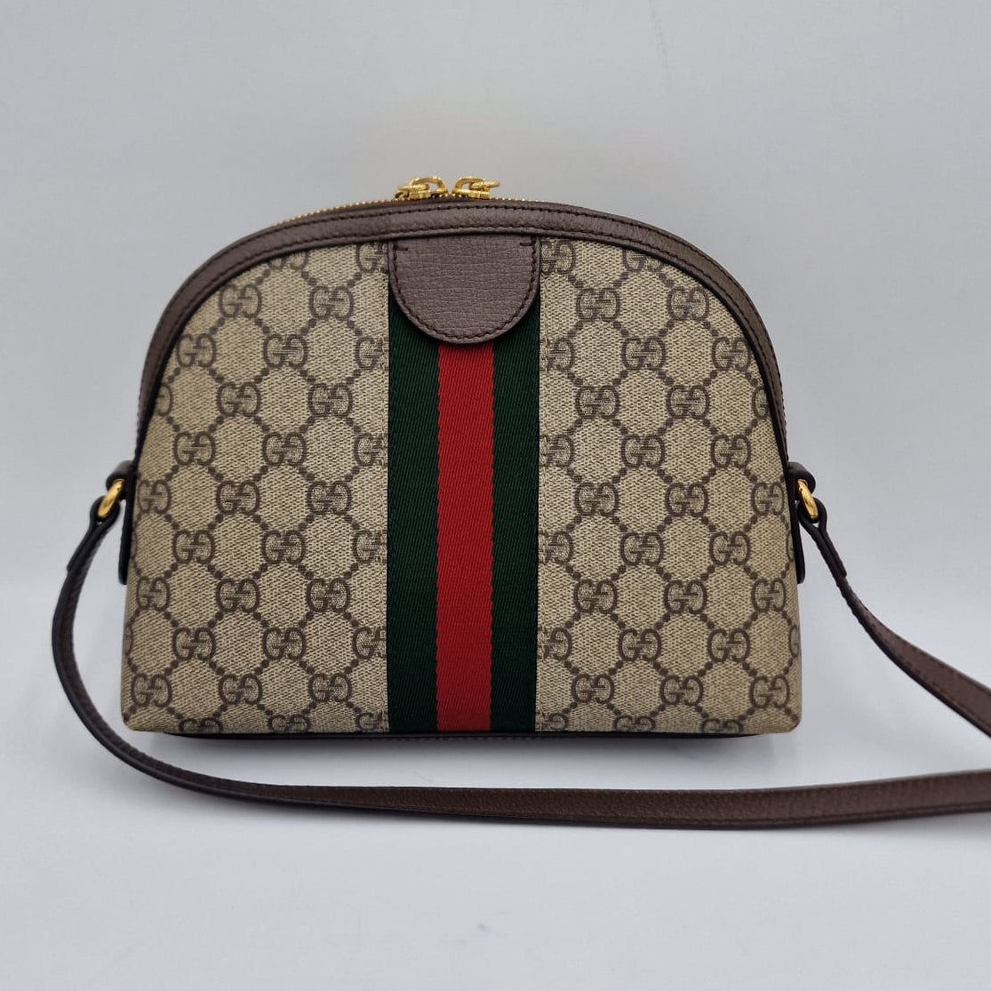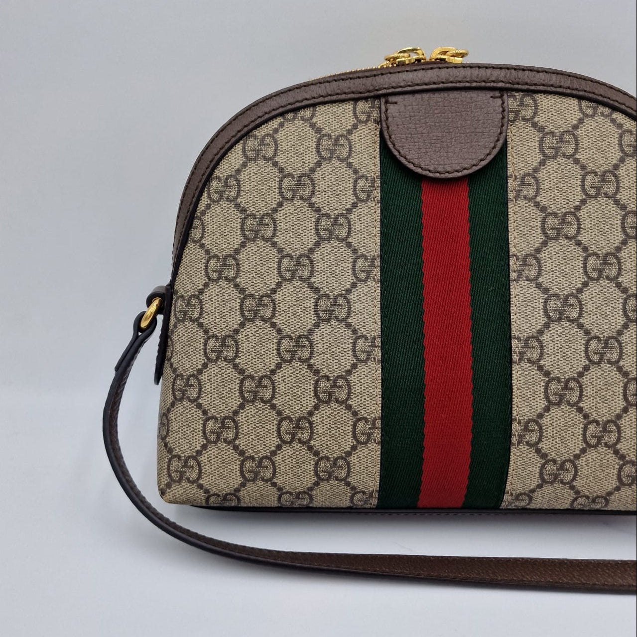 Confeccionada em GG Supreme com detalhe de faixa Web incrustada, a bolsa de ombro tem um formato abobadado que remete a designs vintage. O Double G, um código de arquivo, aparece em um detalhe de aba de couro e no puxador do fecho.
