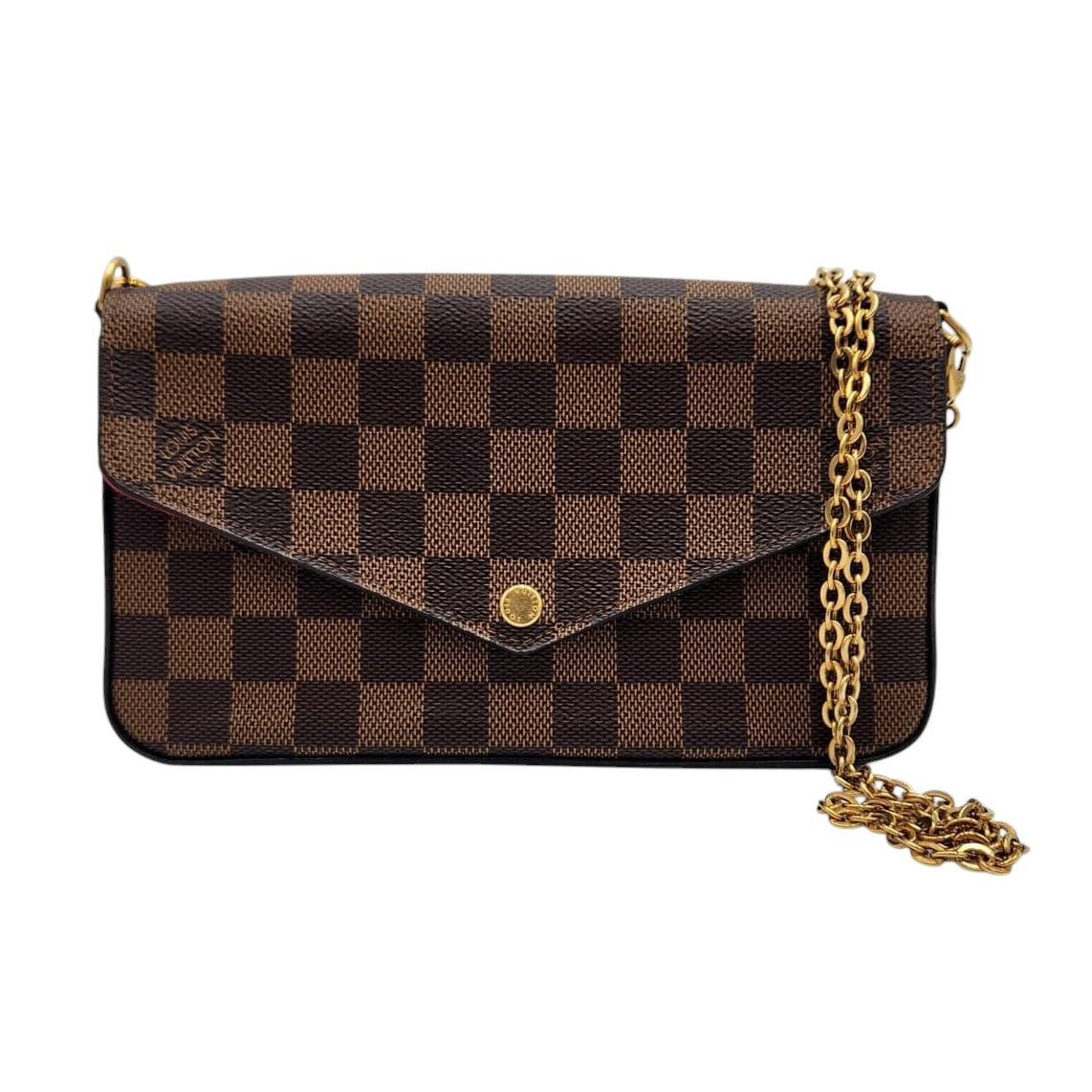 A Louis Vuitton Félicie é uma bolsa versátil e é confeccionada em canvas Damier Azur e forrada com microfibra rosa. No interior, conta com dois bolsos: um sem fecho e outro plano, com oito divisórias para cartões. A corrente metálica dourada é removível e permite usá-la no ombro ou na transversal. A Félicie é finalizada com um botão de pressão.